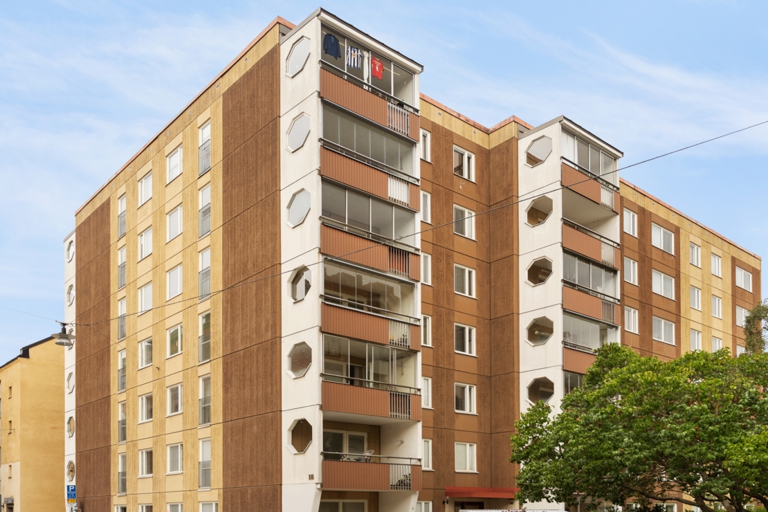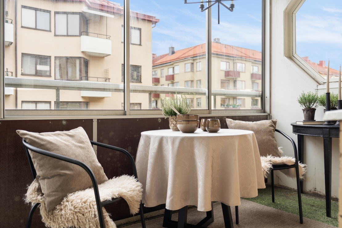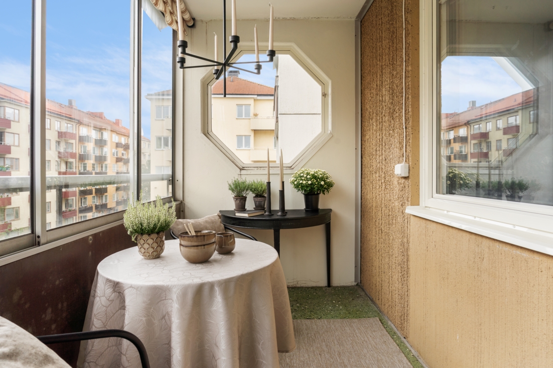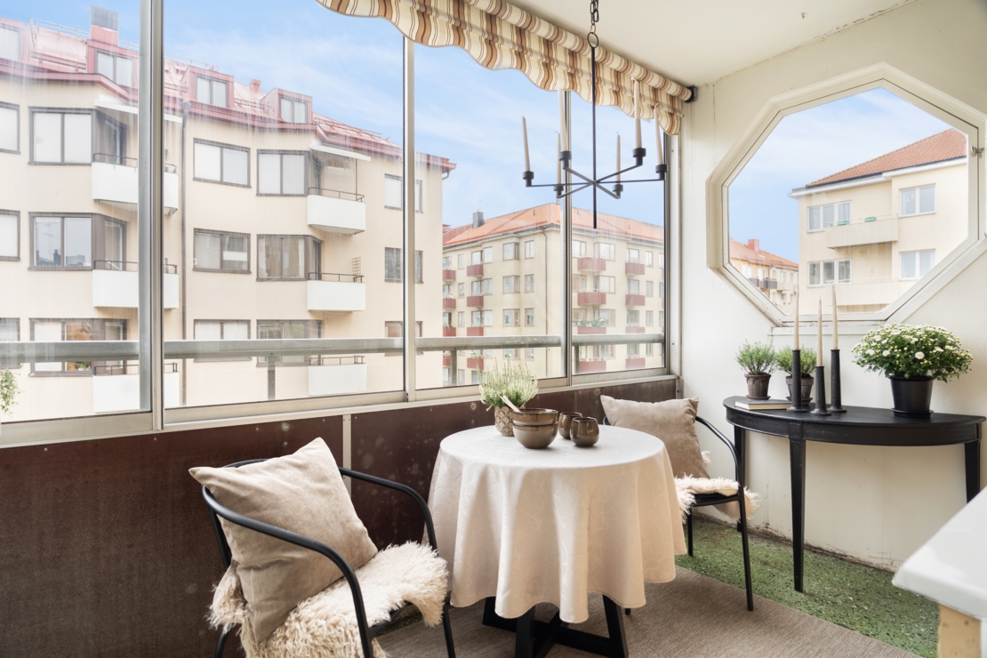 Välplanerad tvåa med inglasad balkong högt upp i huset med stor hiss på mysiga Alströmergatan