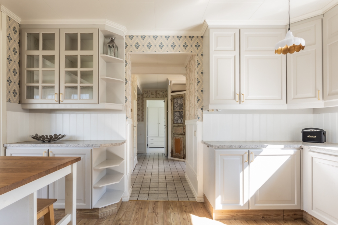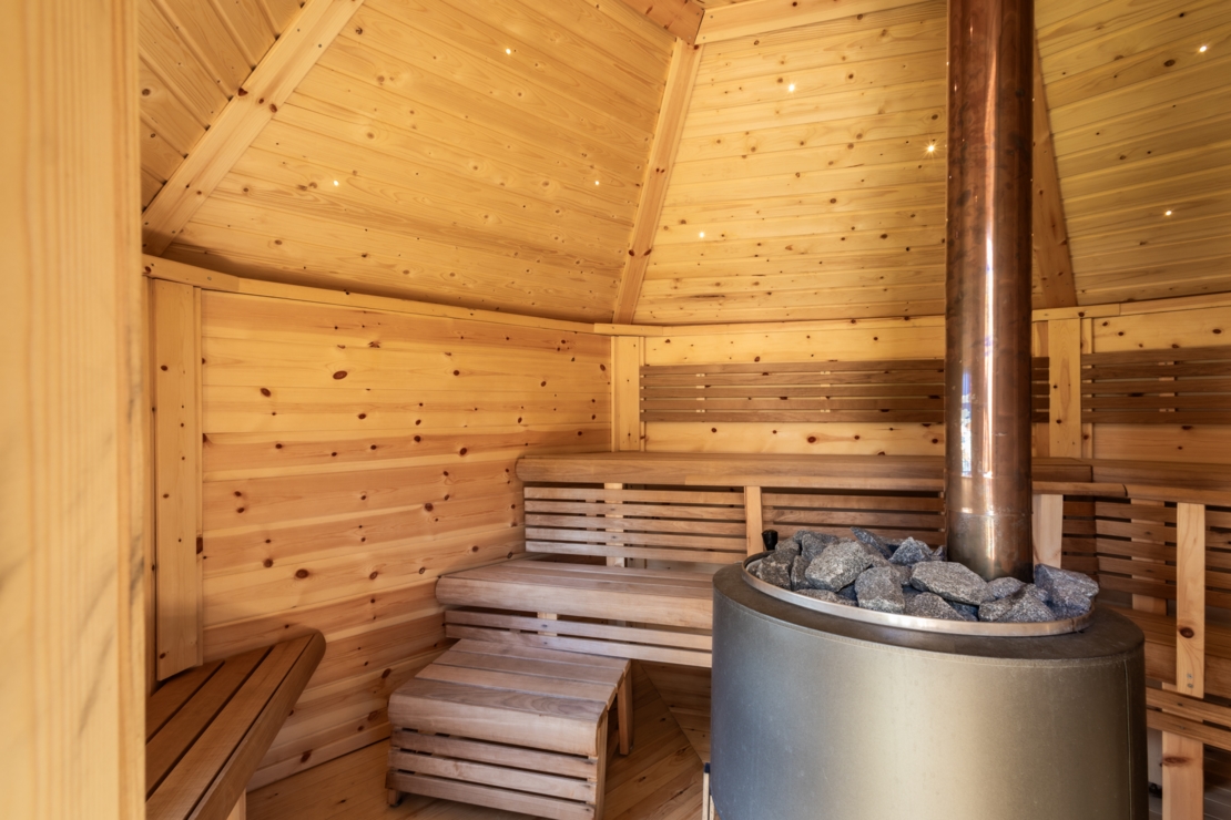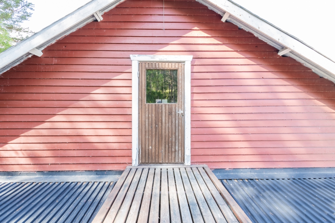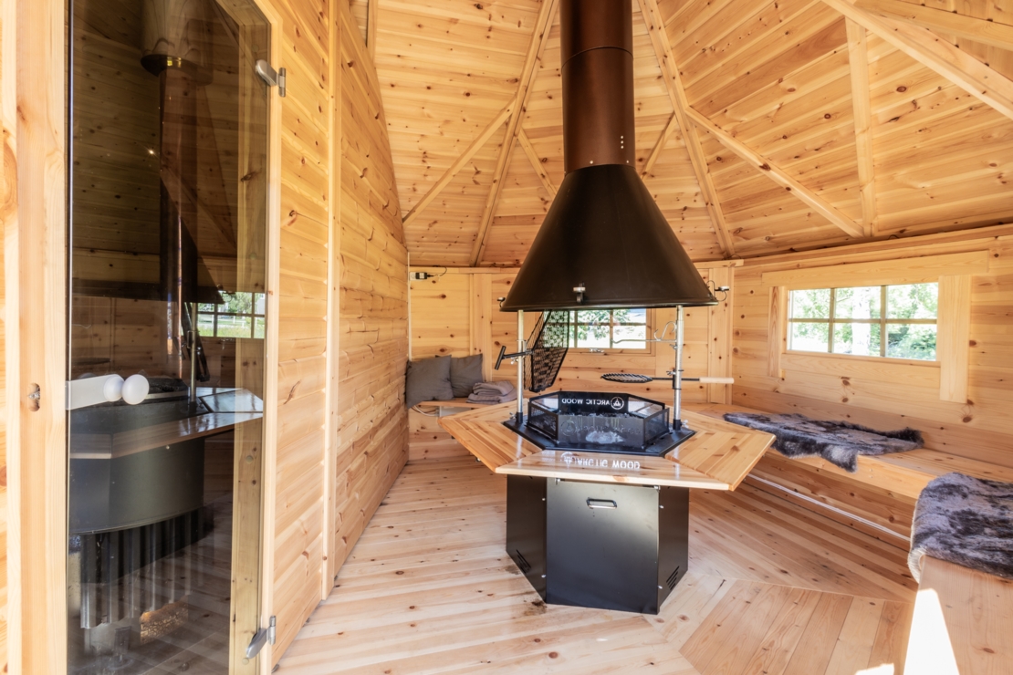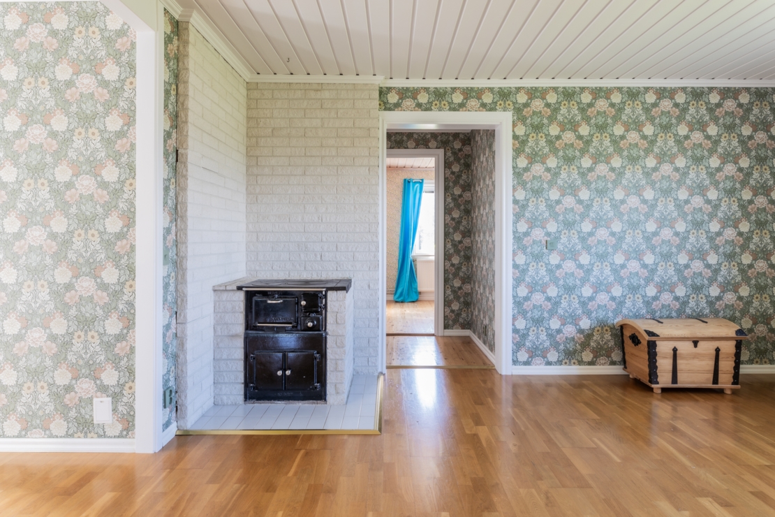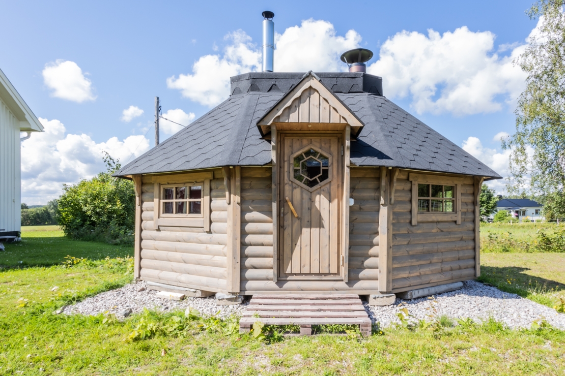 En välomhändertagen, gammal timrad bagarstuga med vedkamin.