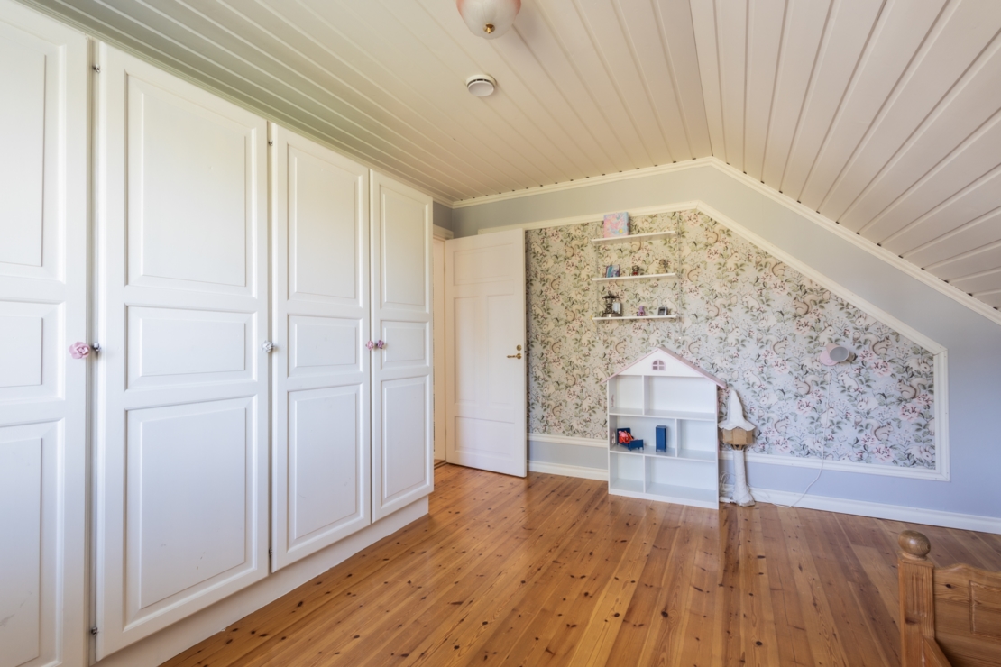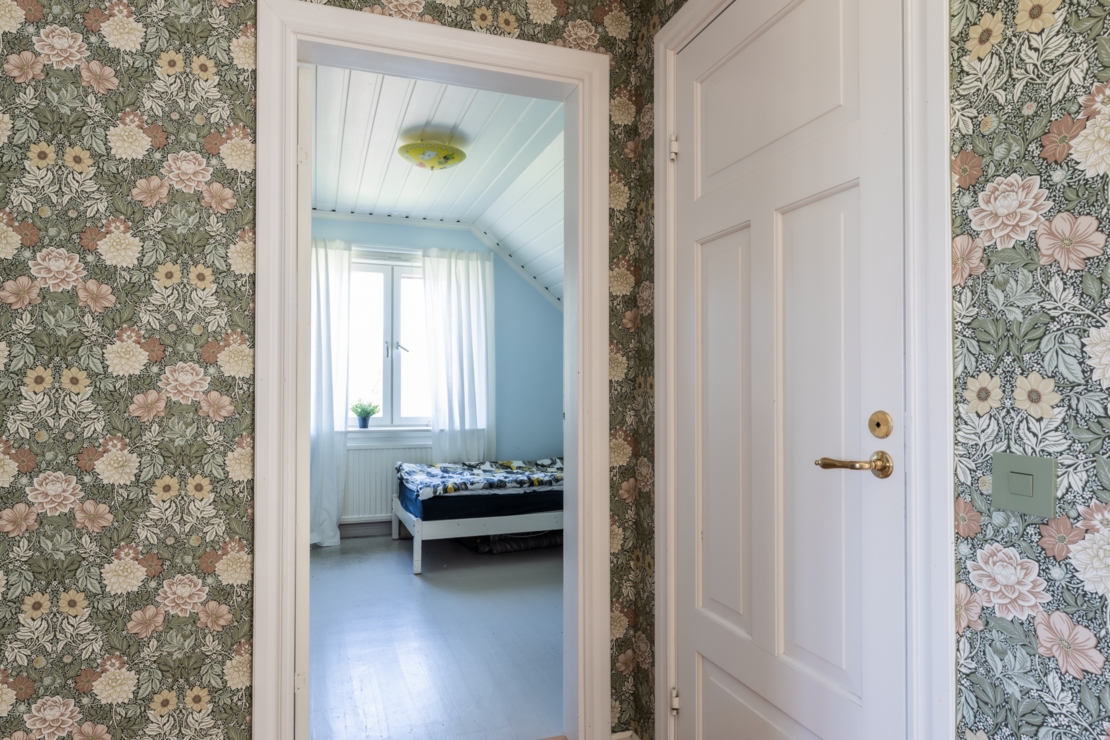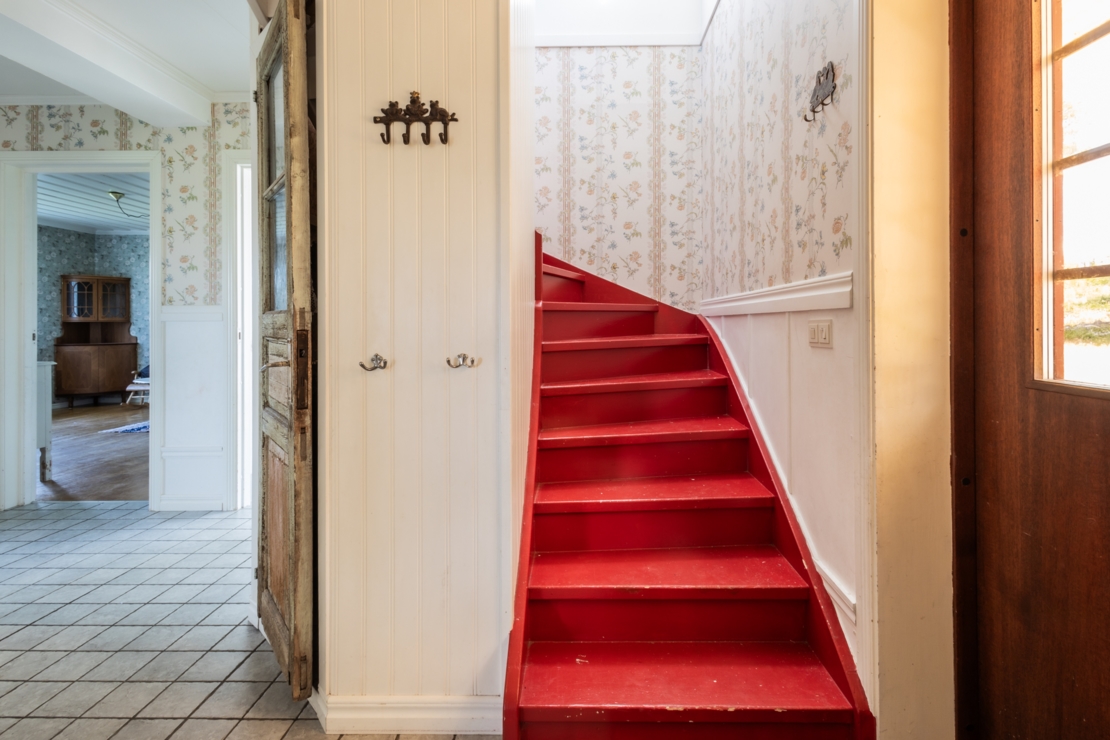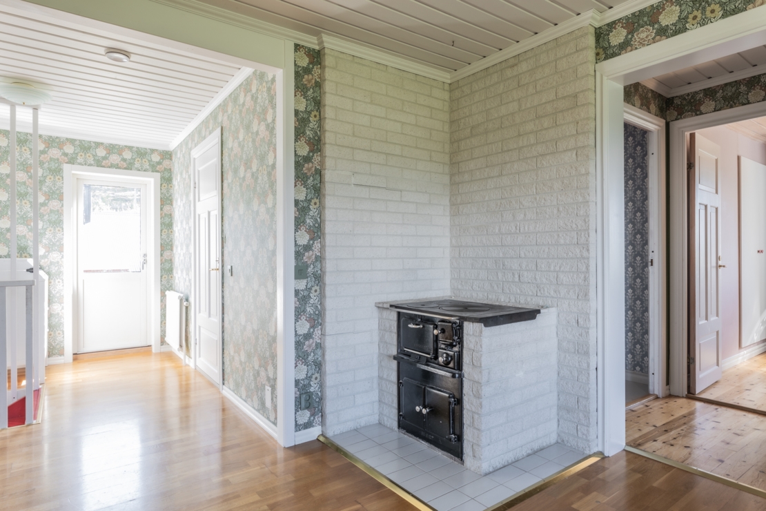 På övre plan finns en stor hall med en obesiktigad vedspis, ett badrum med toalett och badkar samt fyra sovrum med vackert trägolv och inbyggda garderober.