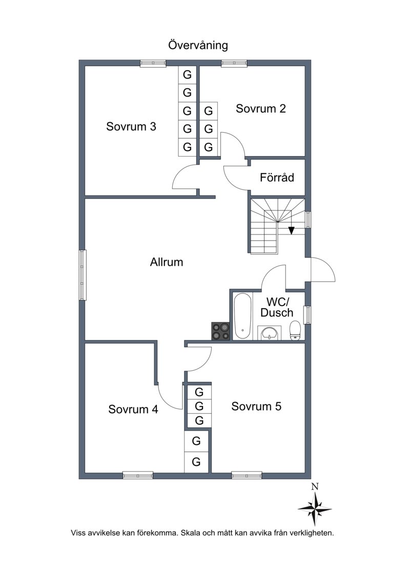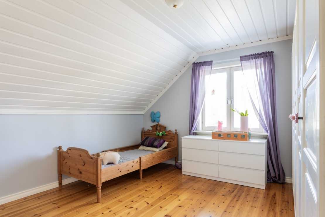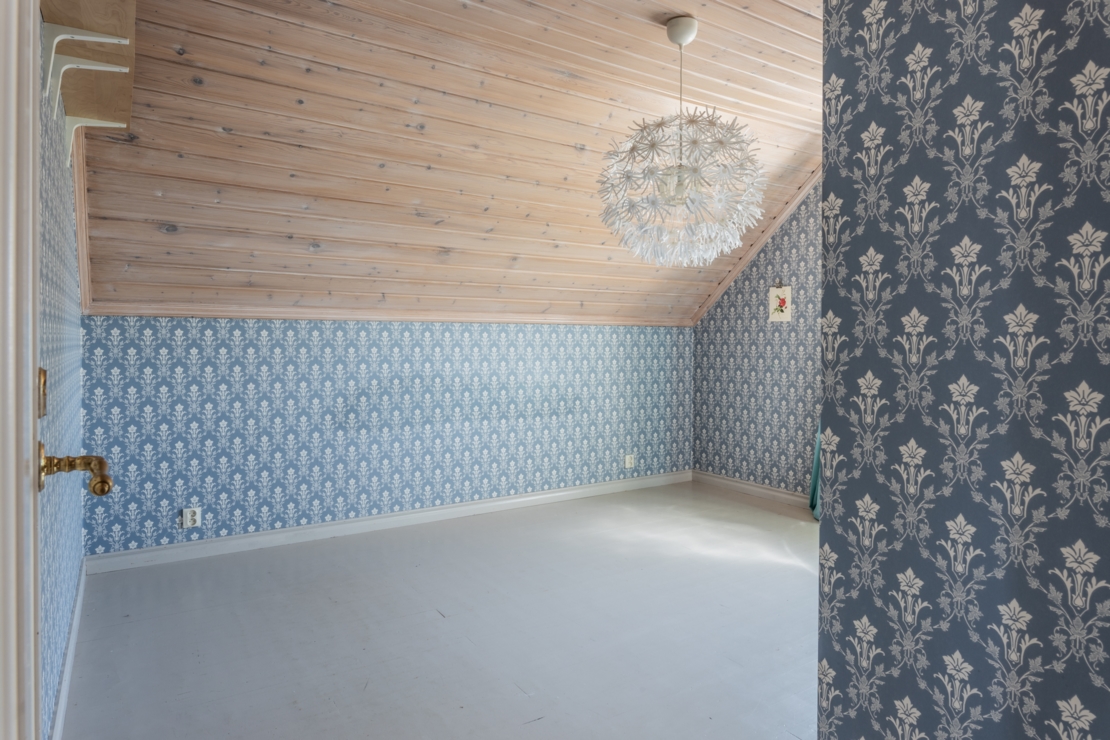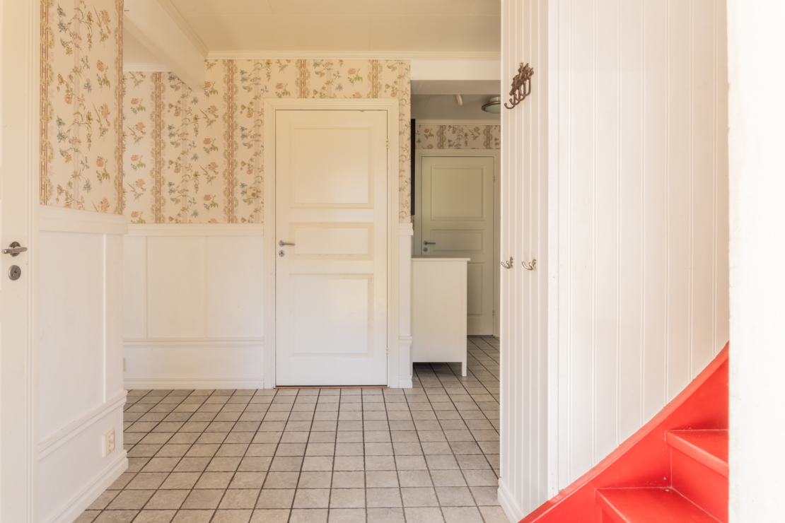 På övre plan finns en stor hall med en obesiktigad vedspis, ett badrum med toalett och badkar samt fyra sovrum med vackert trägolv och inbyggda garderober.