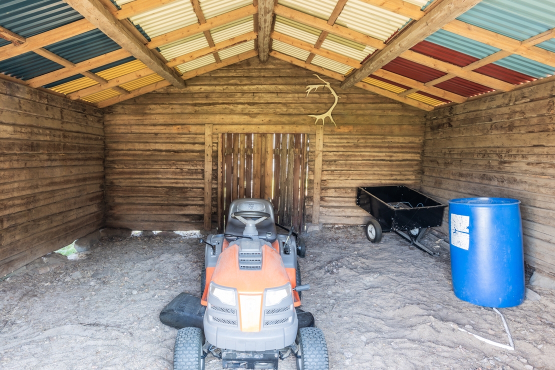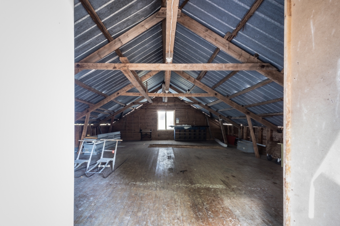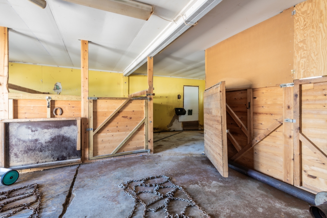 En cirka 100 kvm lada med två stallboxar, vedförråd, hönsgård och ett stort oinrett loft med stora möjligheter.