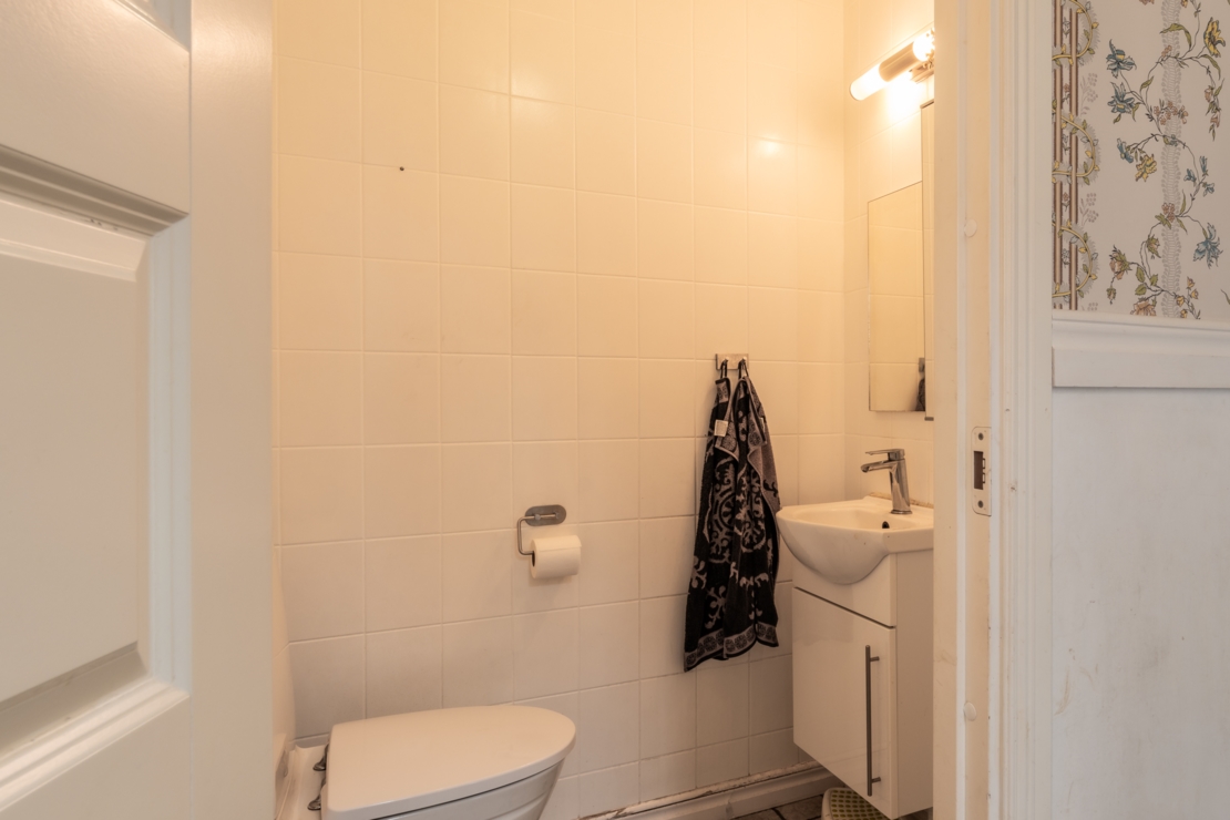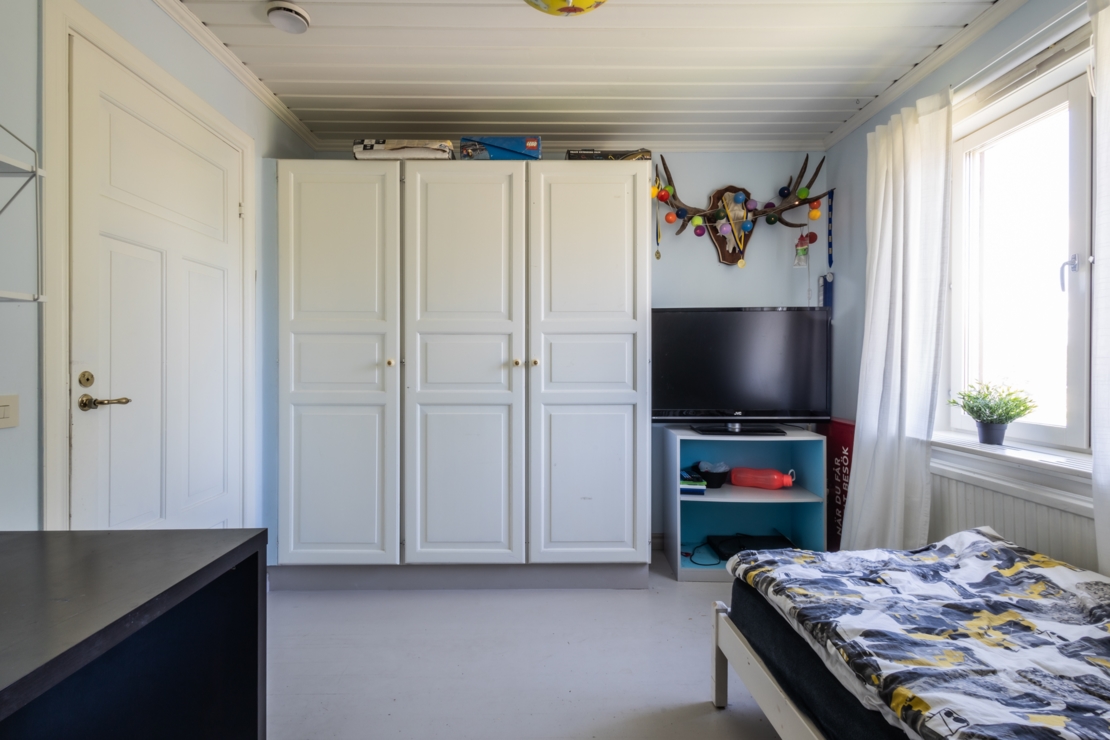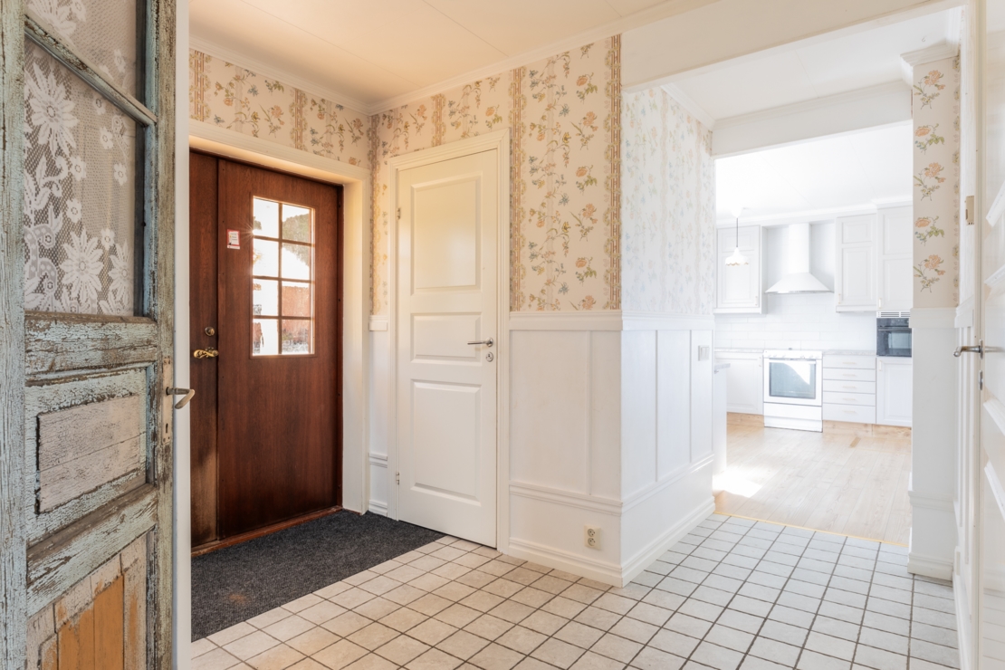 Entréplan erbjuder ett välutrustat och rymligt kök med matplats, nyare vitvaror och tillgång till en stor altan på husets södra sida. Här finner man även ett trevligt sovrum, ett stort vardagsrum, en tvättstuga, en bastu med dusch, samt en kaklad toalett.