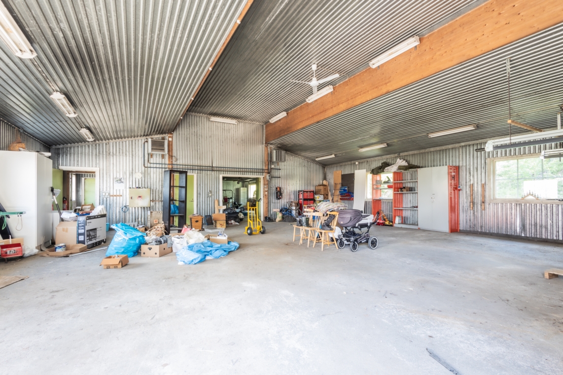 En 276 kvm stor och isolerad garage/maskinhall på betongplatta som är utrustad med 3-glas fönster samt toalett och dusch.