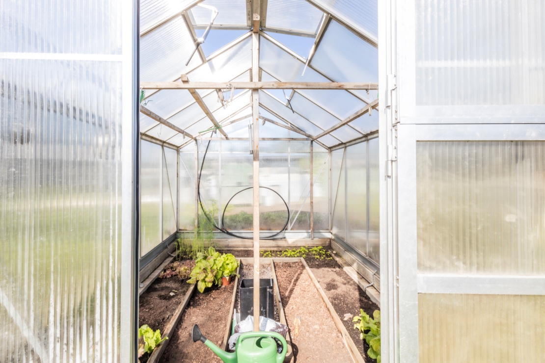 På husets baksida finns en uteplats i söderläge, delvis under tak, med härlig utsikt över trädgården. Trädgården erbjuder stora odlingsmöjligheter och har bland annat svartvinbärsbuskar, stora jordgubbsland, växthus och grönsaksodlingar.
