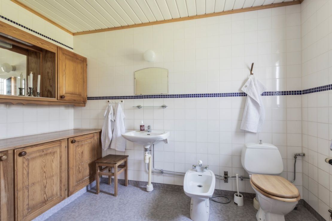 Huset är utrustat med centraldammsugare och värms upp med fjärrvärme, luftvärmepump och vedspis. Ett mekaniskt ventilationssystem med värmeåtervinning förbättrar energieffektiviteten.