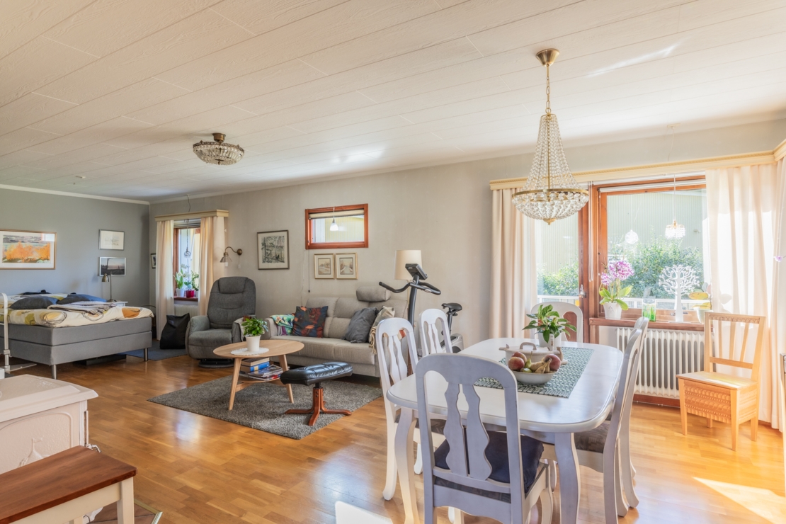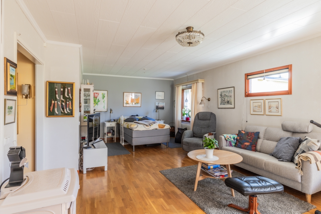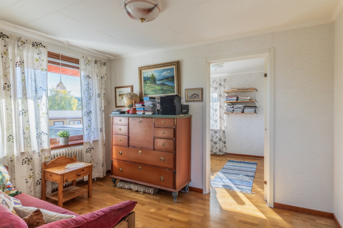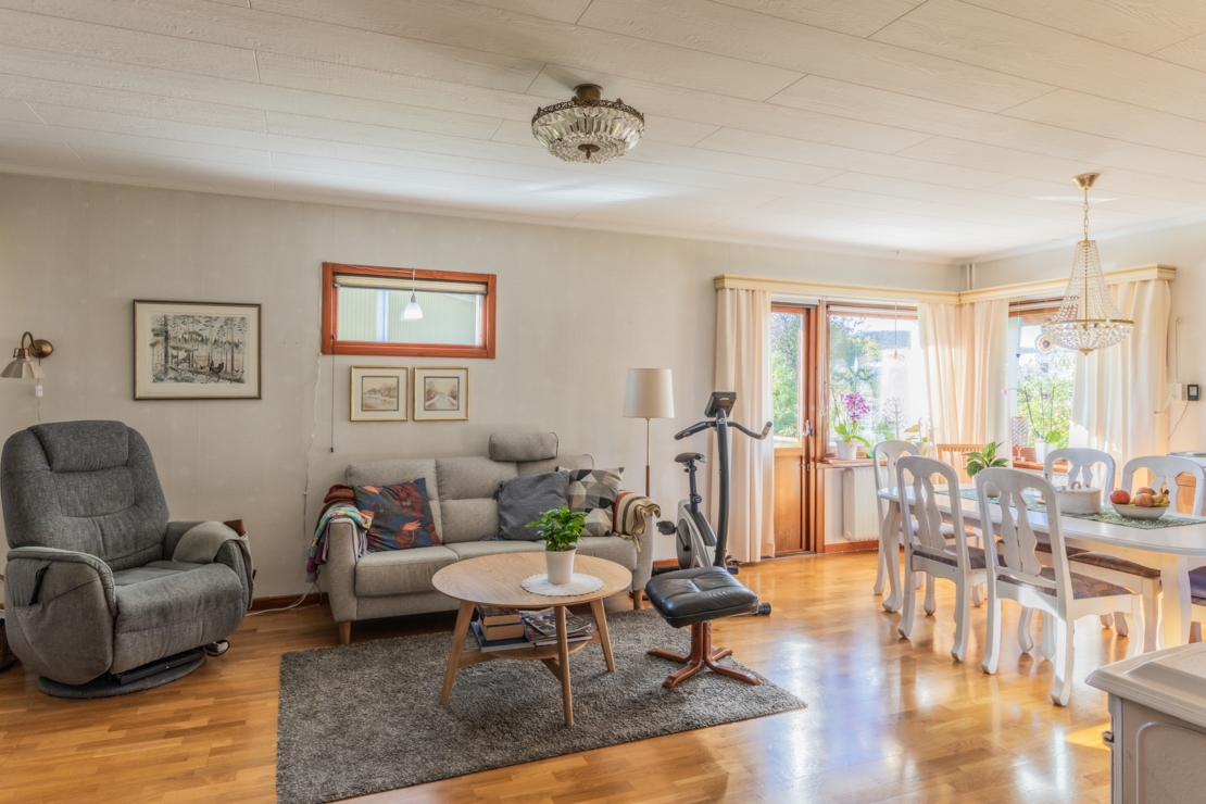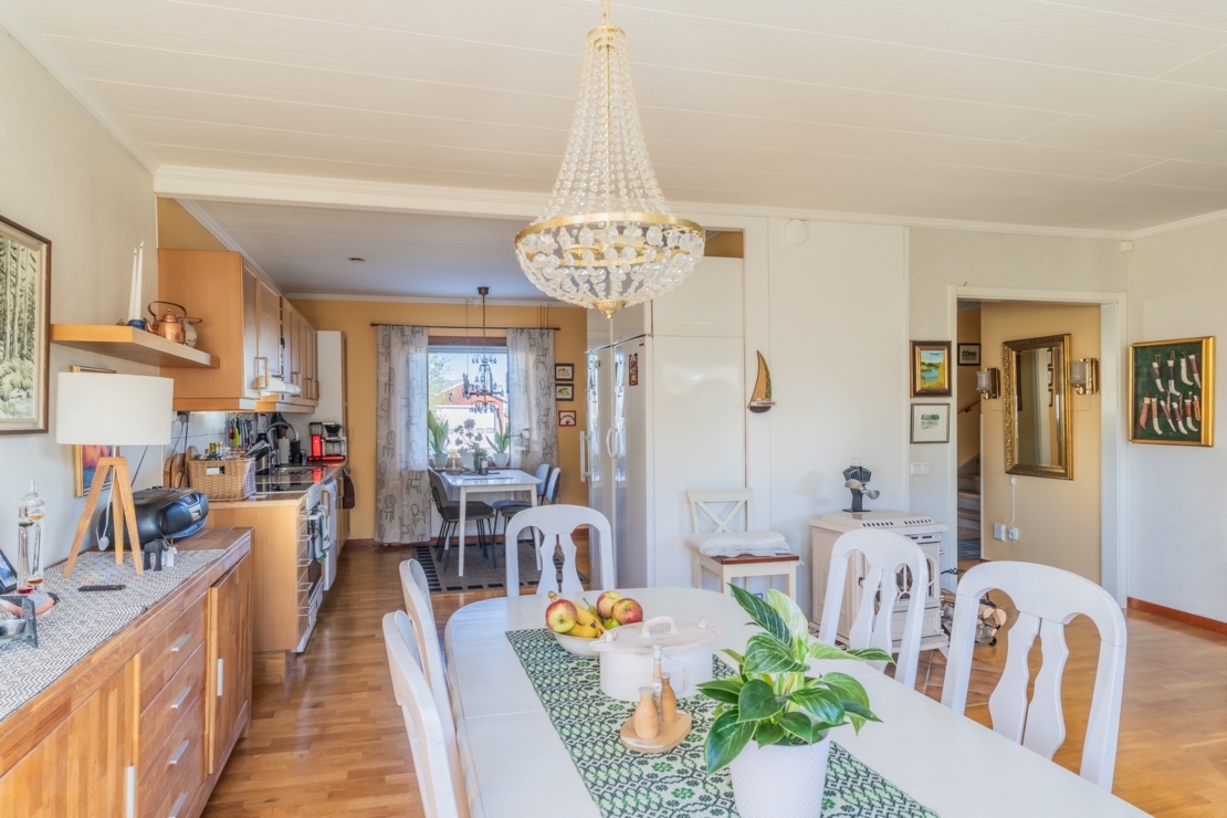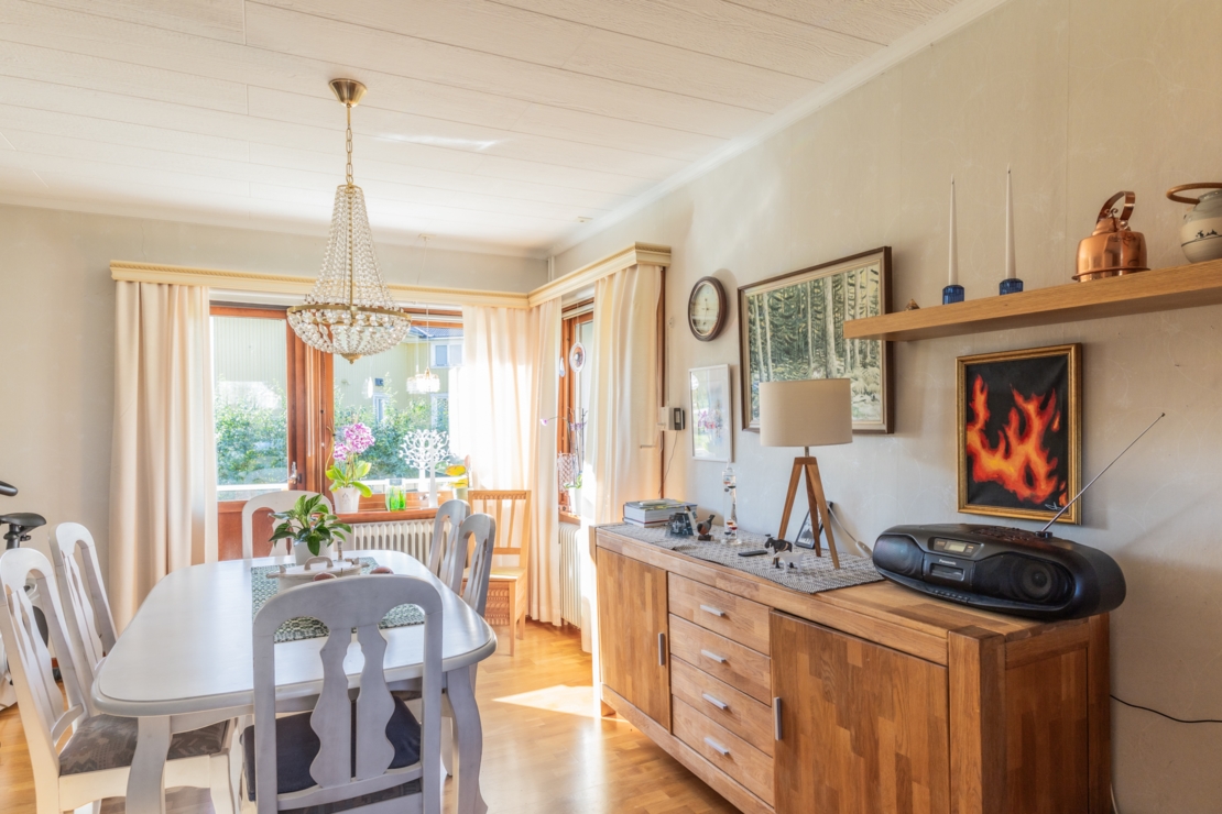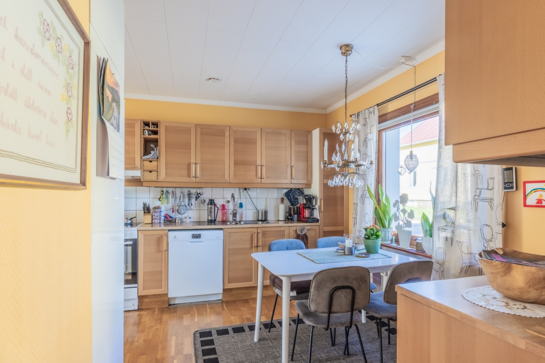 Bostadshuset är i normalt gott skick och erbjuder en trivsam planlösning. På bottenplanet finns ett stort, öppet utrymme där kök, matplats och vardagsrum smälter samman. Här finns en vedspis, och från vardagsrummet når man altanen med glasräcke i ett soligt läge med utsikt över den trevliga trädgården. Badrummet är utrustat med dusch och toalett. Övre plan rymmer fyra ljusa rum, varav två större och tre mindre, samt en toalett. Centraldammsugare och markiser är installerade för extra komfort. I källaren finns bastu, dusch, pannrum och tvättstuga.