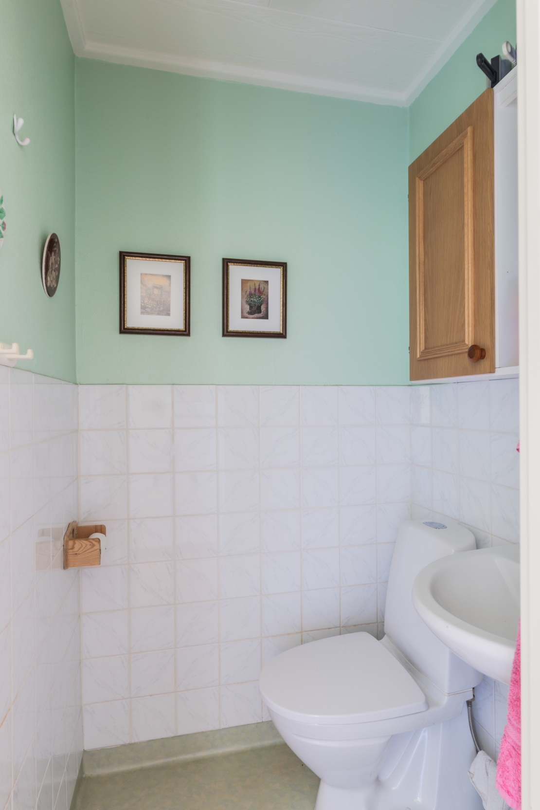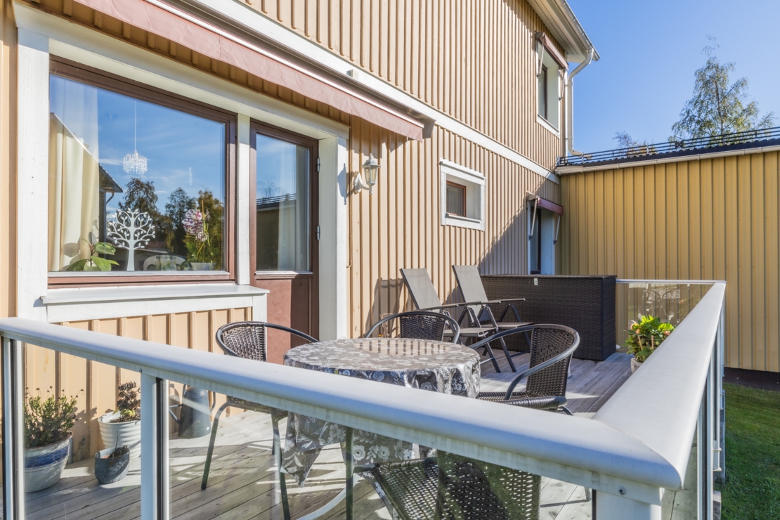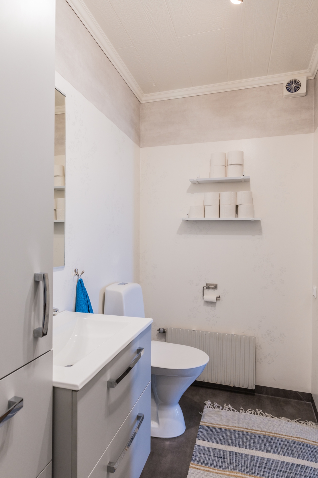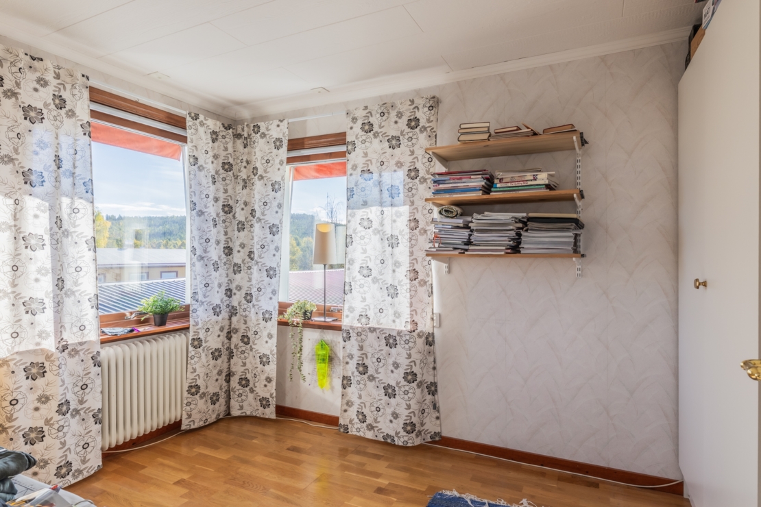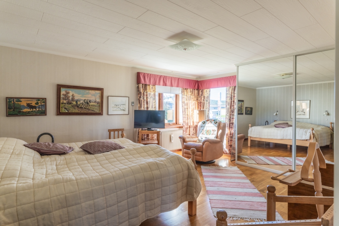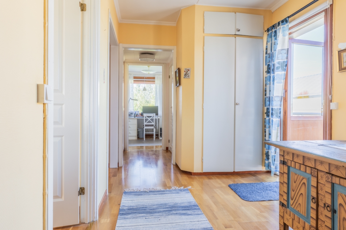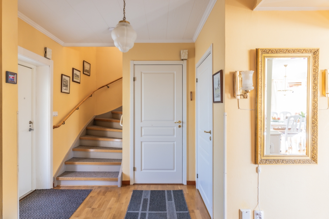 Bostadshuset är i normalt gott skick och erbjuder en trivsam planlösning. På bottenplanet finns ett stort, öppet utrymme där kök, matplats och vardagsrum smälter samman. Här finns en vedspis, och från vardagsrummet når man altanen med glasräcke i ett soligt läge med utsikt över den trevliga trädgården. Badrummet är utrustat med dusch och toalett. Övre plan rymmer fyra ljusa rum, varav två större och tre mindre, samt en toalett. Centraldammsugare och markiser är installerade för extra komfort. I källaren finns bastu, dusch, pannrum och tvättstuga.