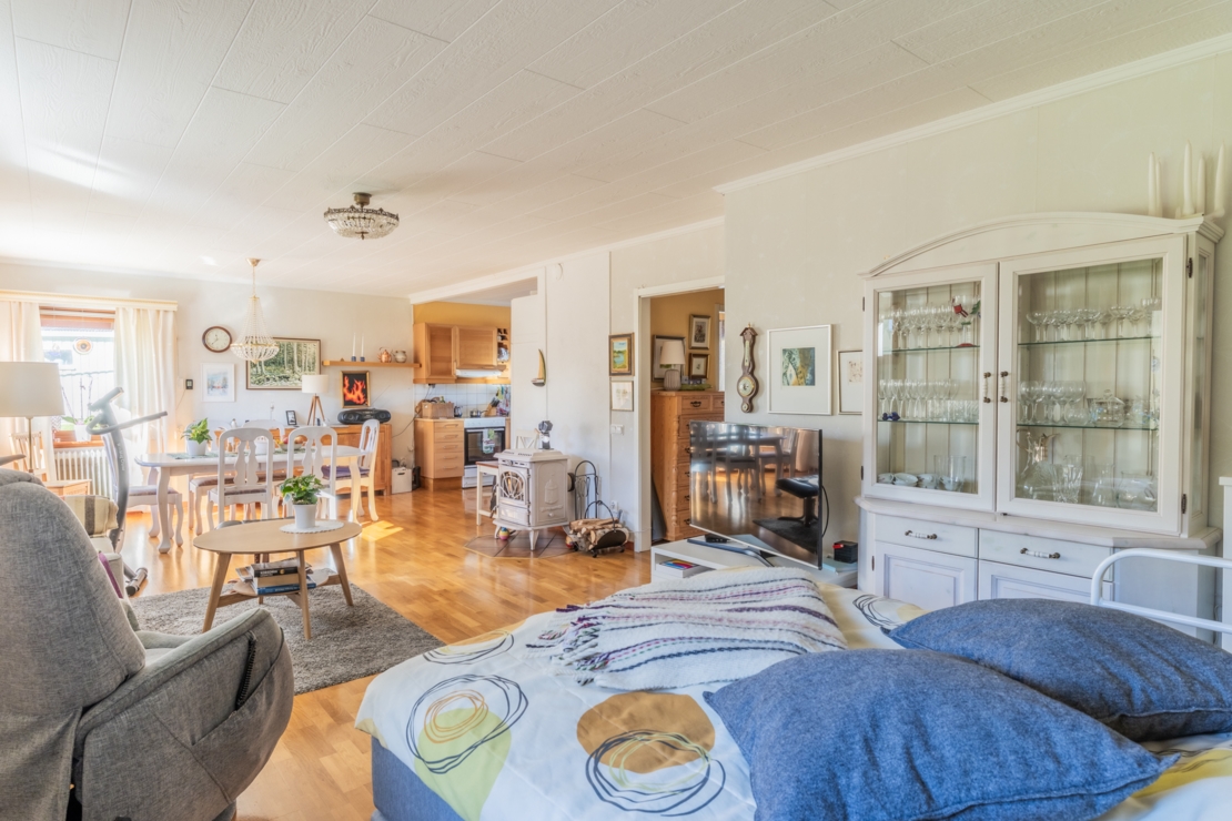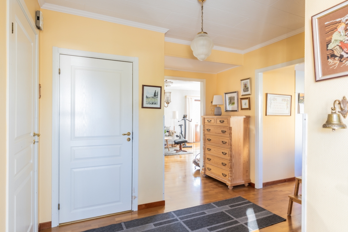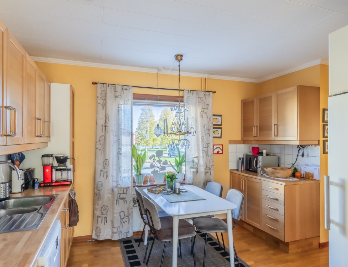 Bostadshuset är i normalt gott skick och erbjuder en trivsam planlösning. På bottenplanet finns ett stort, öppet utrymme där kök, matplats och vardagsrum smälter samman. Här finns en vedspis, och från vardagsrummet når man altanen med glasräcke i ett soligt läge med utsikt över den trevliga trädgården. Badrummet är utrustat med dusch och toalett. Övre plan rymmer fyra ljusa rum, varav två större och tre mindre, samt en toalett, och markiser är installerade för extra komfort. I källaren finns bastu, dusch, pannrum och tvättstuga.