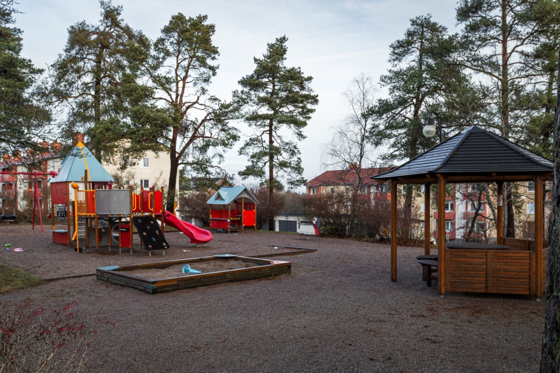 Garage, parkeringsplatser, tvättstugor, flera lekplatser.