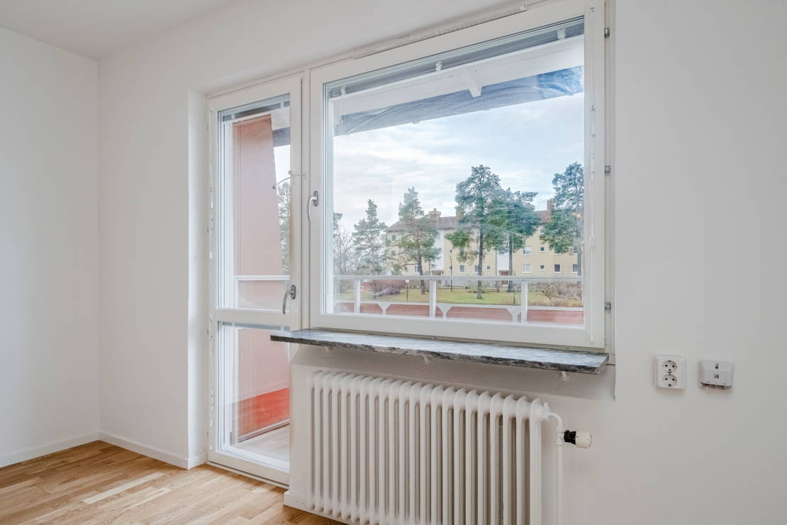 Stort fönster och balkongdörr ger vardagsrummet ett härligt ljusflöde. Det finns gott om plats för soffa, tv-möbel, samt ett skrivbord med ytterligare möblemang.
