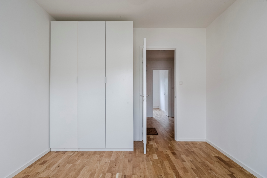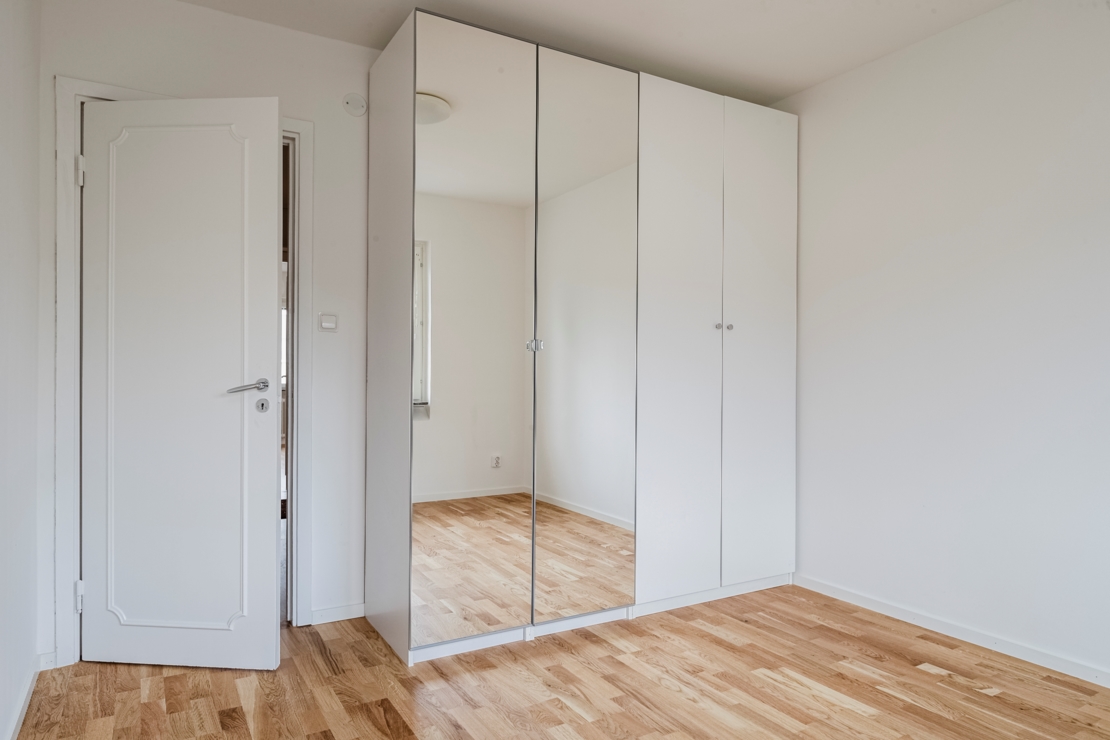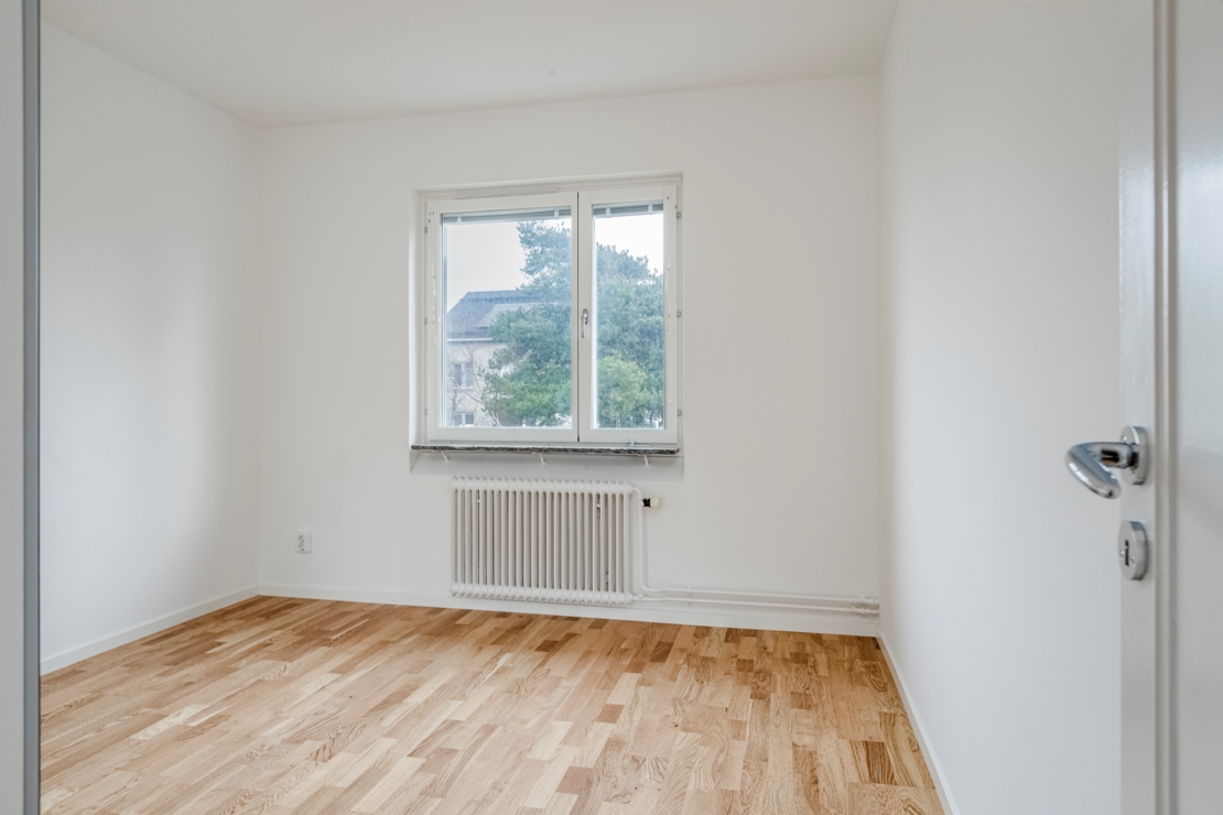 Sovrummet är stort och har gott om plats för en dubbelsäng och sängbord. Stora fönster med gott om ljusinsläpp. Garderobsvägg.