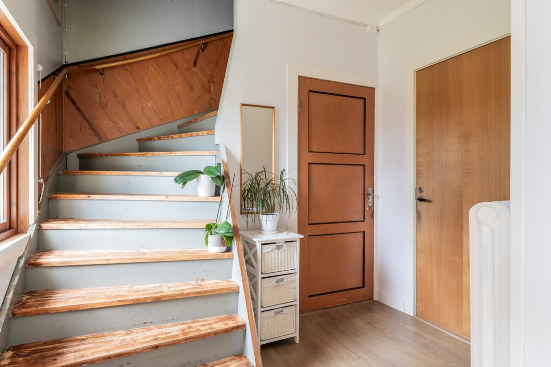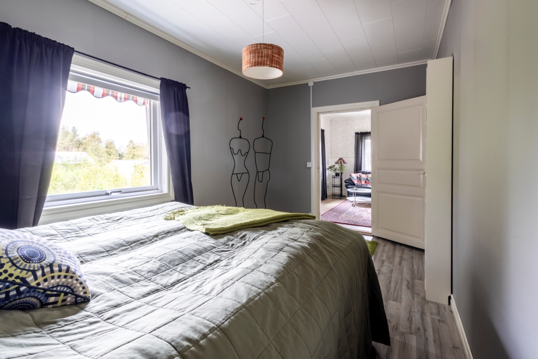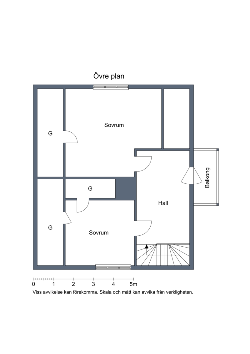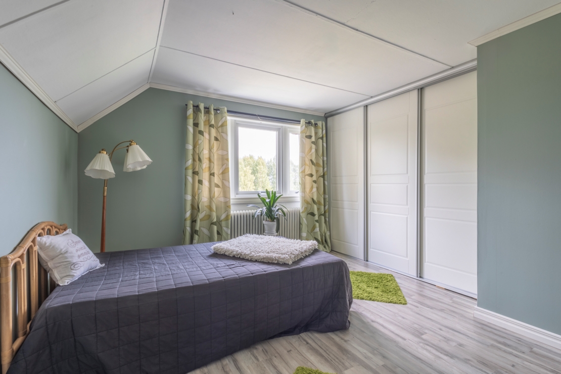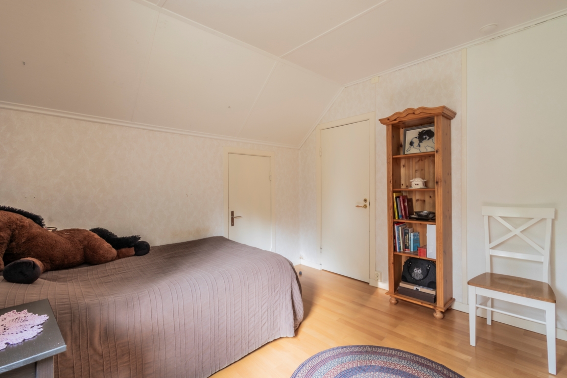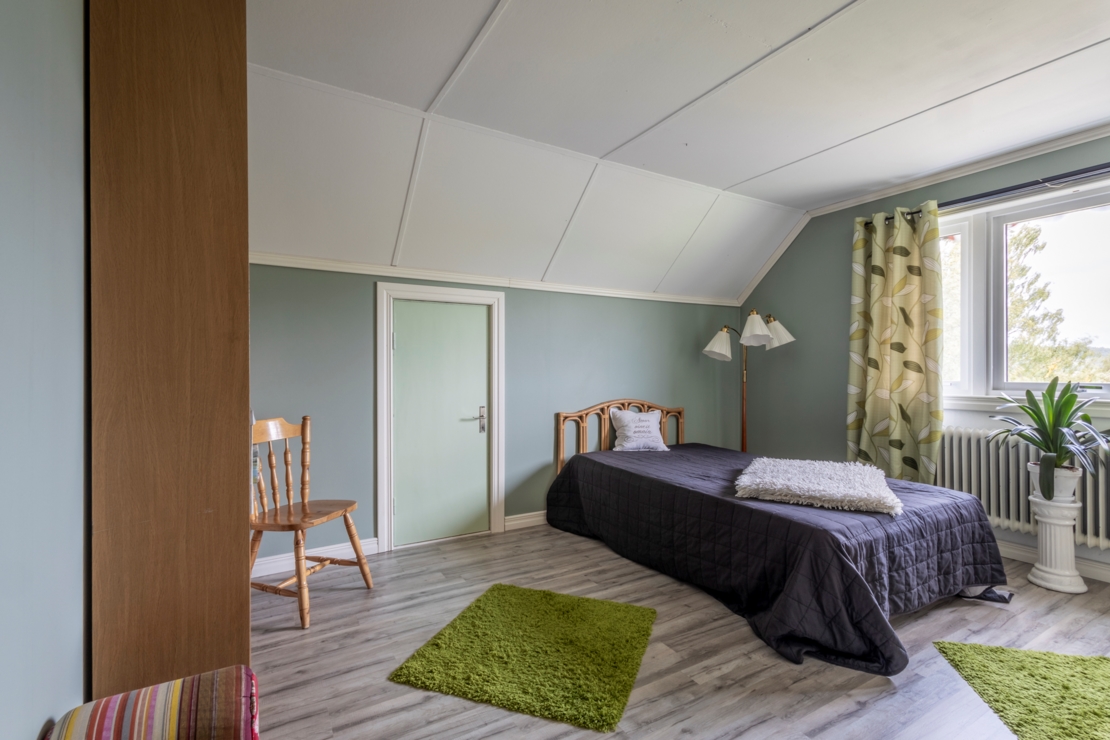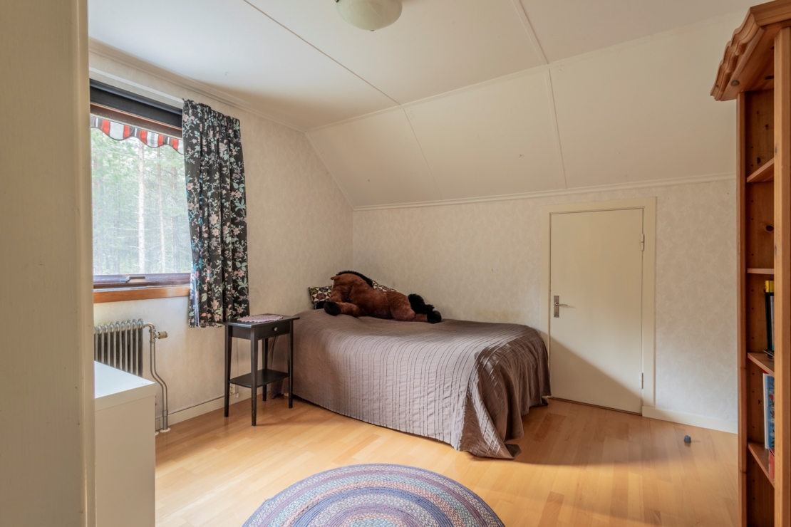 Övre plan består av två sovrum och en hall med utgång till balkongen. Det ena sovrummet har nytt laminatgolv och en stor garderob med skjutdörrar, medan det andra sovrummet har ett äldre badrum med dusch och bidé.