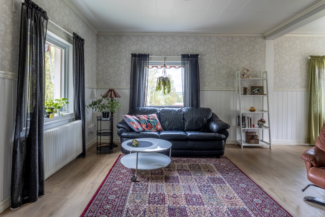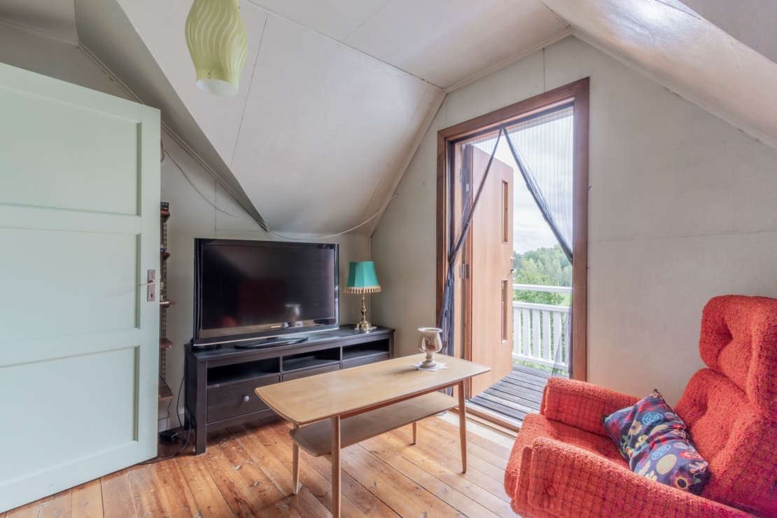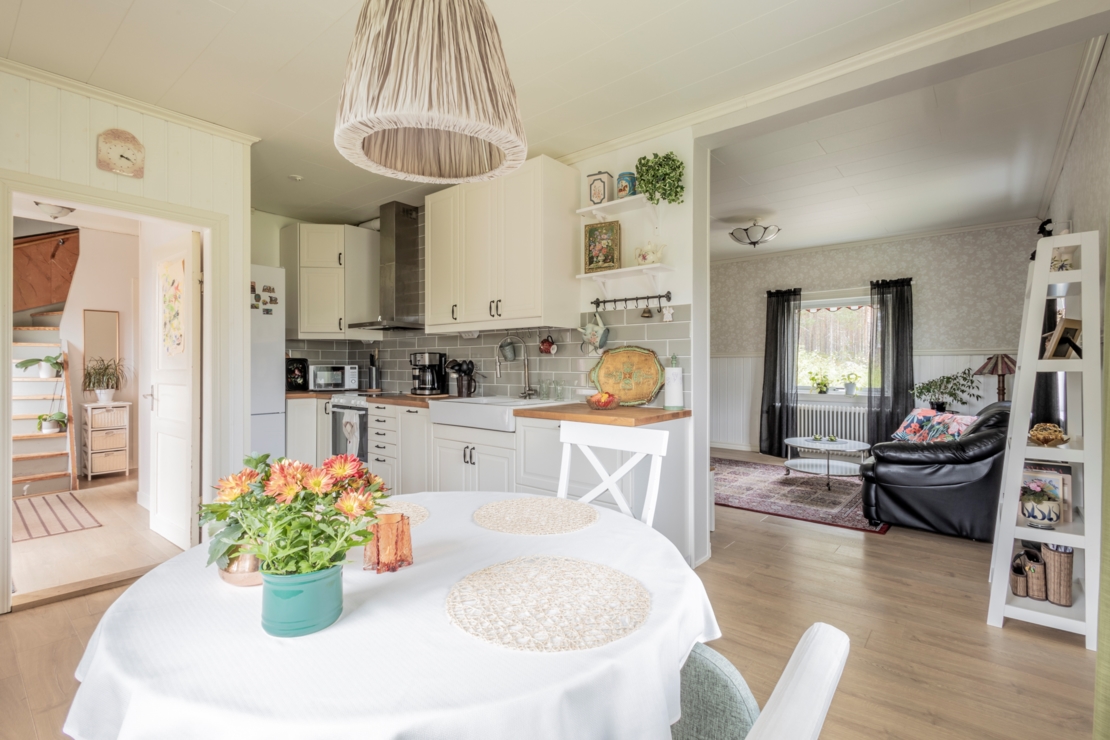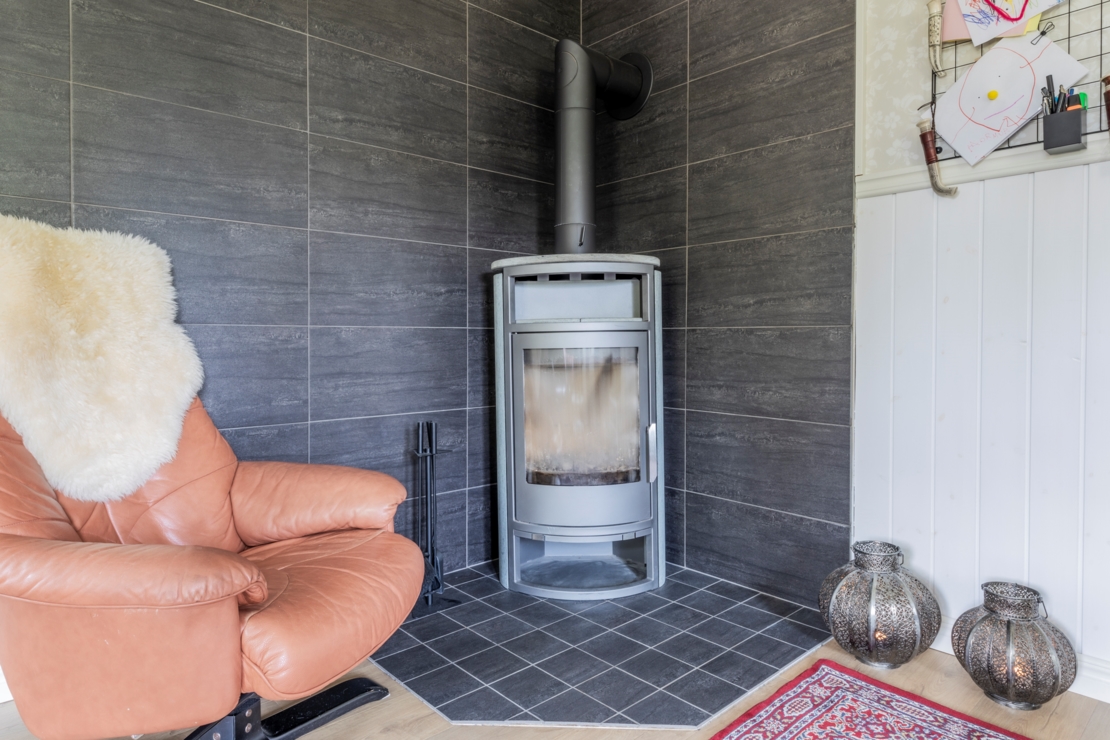 På entréplanet finner du ett välutrustat Ikea-kök med kyl/frys (2022), ett modernt vardagsrum med vedkamin, sovrum, samt ett rymligt badrum med dusch, toalett och tvättmaskin.