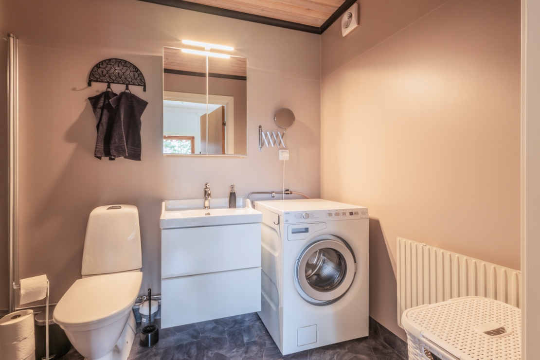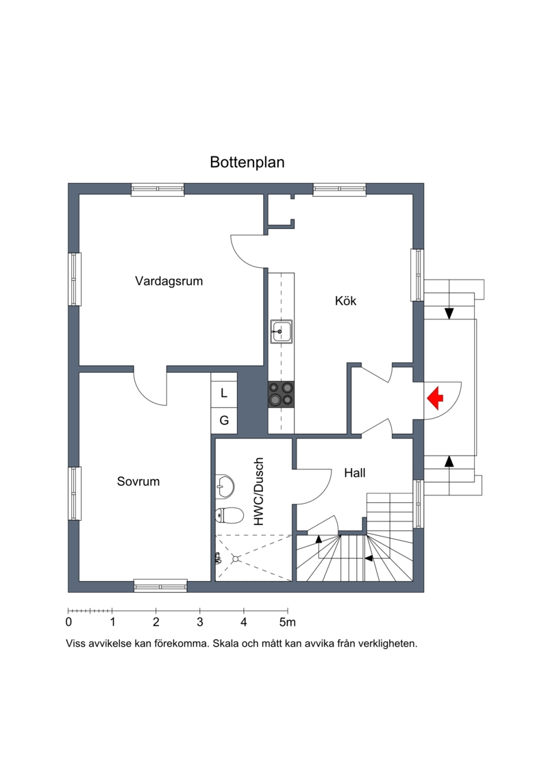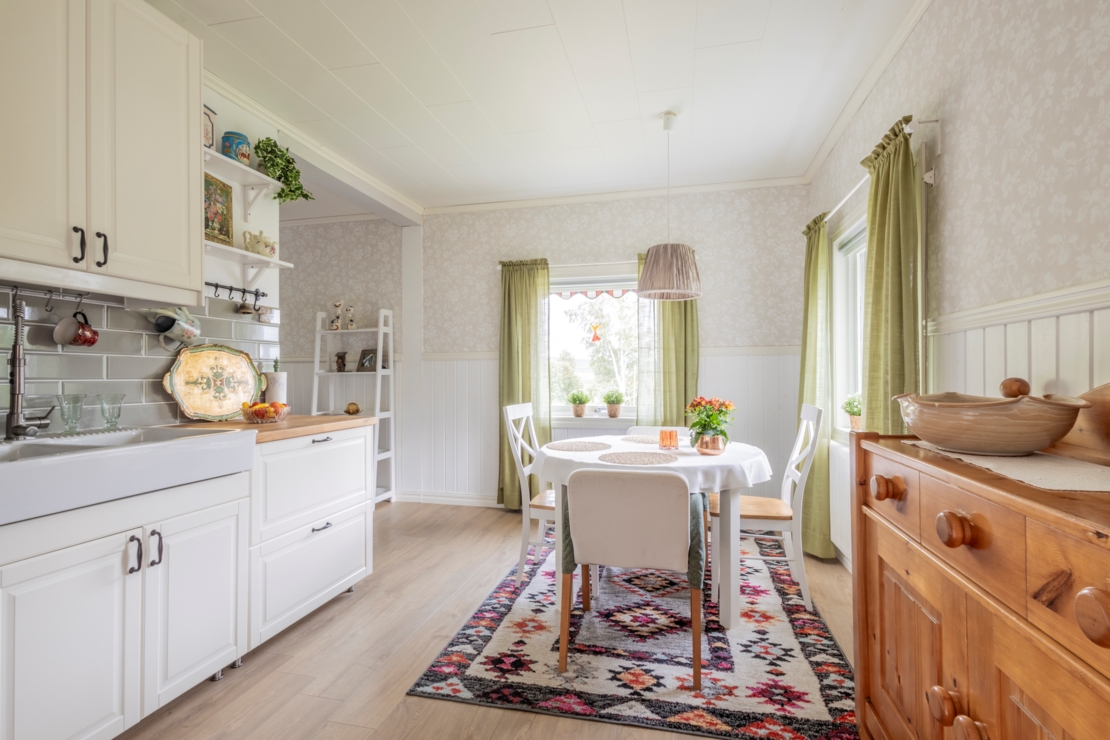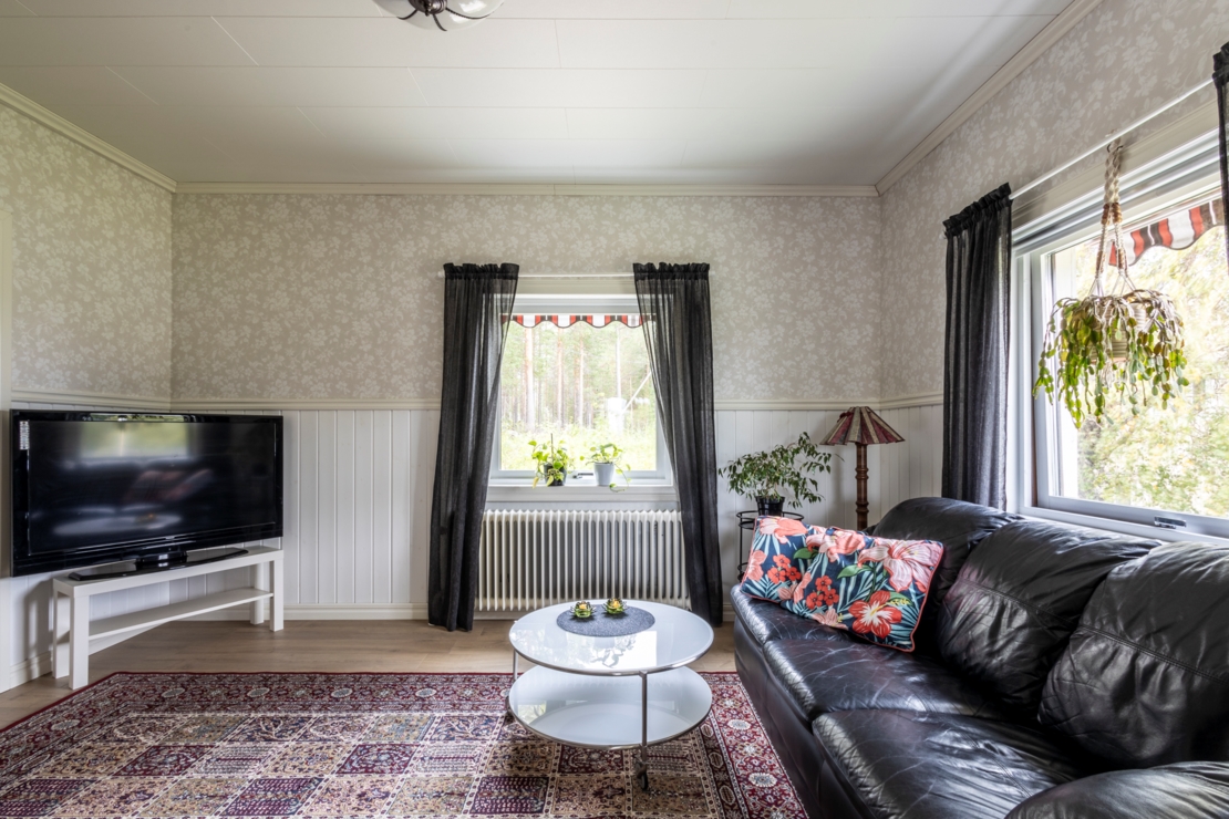 På entréplanet finner du ett välutrustat Ikea-kök med kyl/frys (2022), ett modernt vardagsrum med vedkamin, sovrum, samt ett rymligt badrum med dusch, toalett och tvättmaskin.