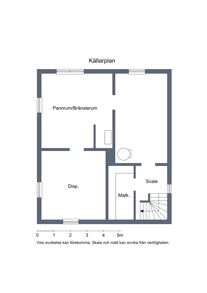 Källaren dränerades och tilläggsisolerades på 1990-talet, och här finns pannrum, matkällare, frys (2019) och förråd (f.d. garage) med gott om förvaringsutrymme.