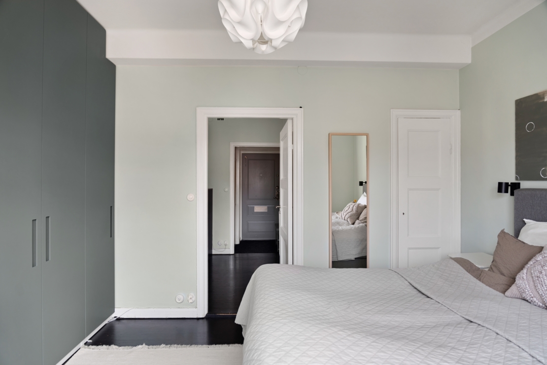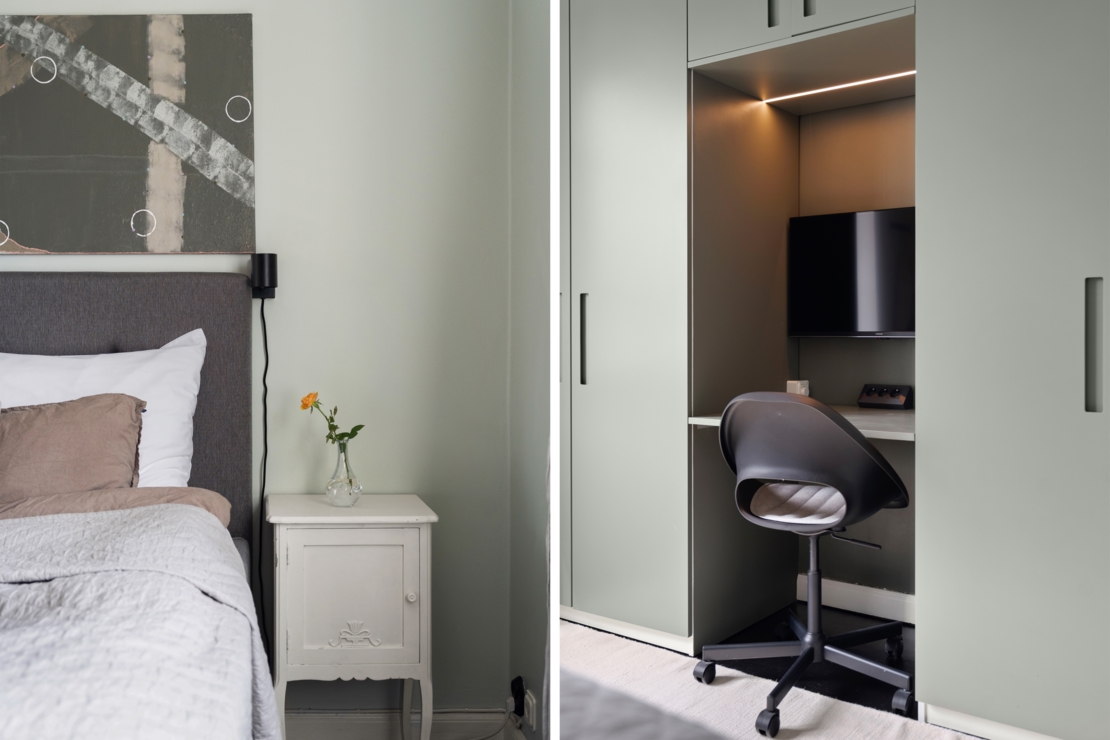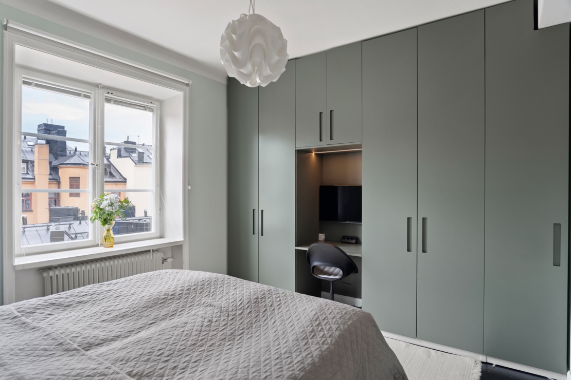 Nyinsatta platsbyggda garderober med skrivbord och dimbar belysning. Plats för 180 säng och sängbord.