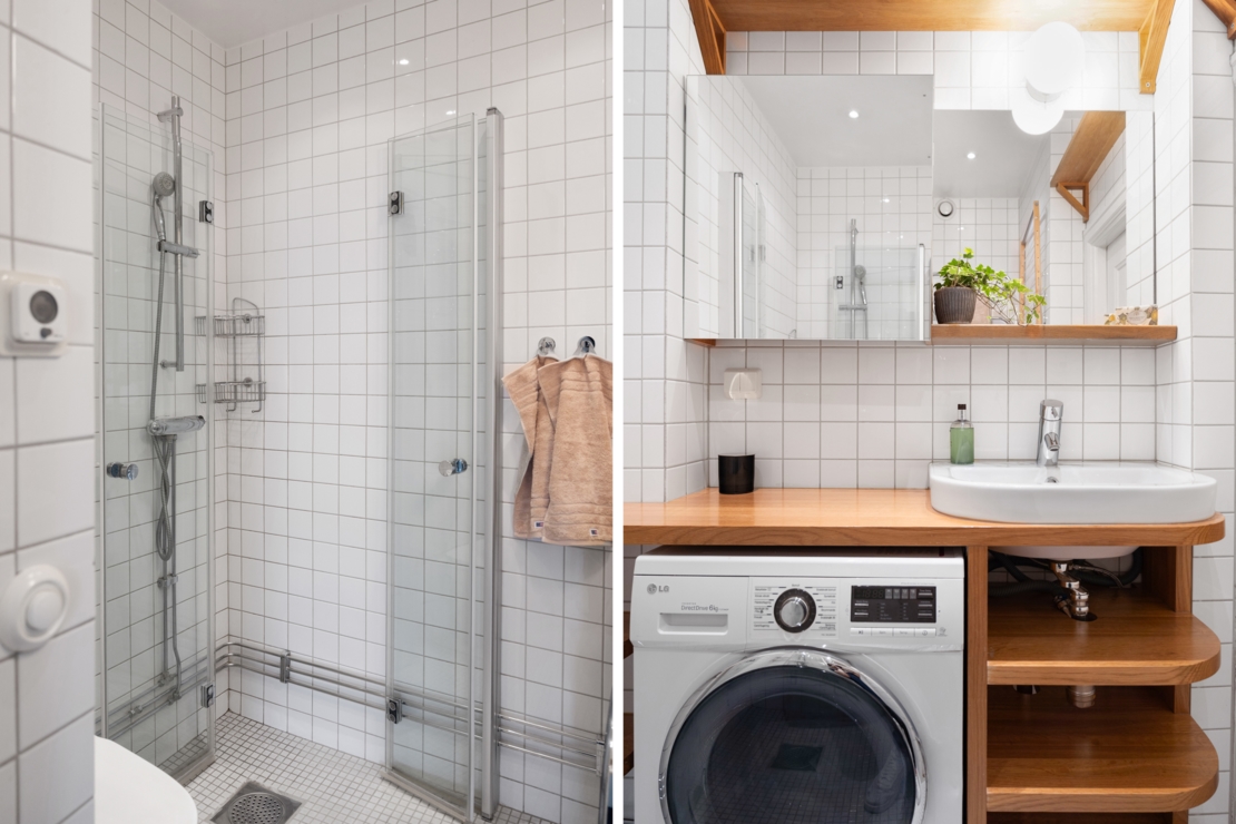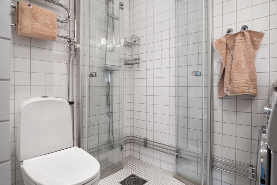 Golvvärme. Helkaklat. Fullstor tvättmaskin. Nyinsatta duschdörrar (2019) Handdukstork. Bra förvaring med många hyllor och badrumsskåp. Bra vattentryck.