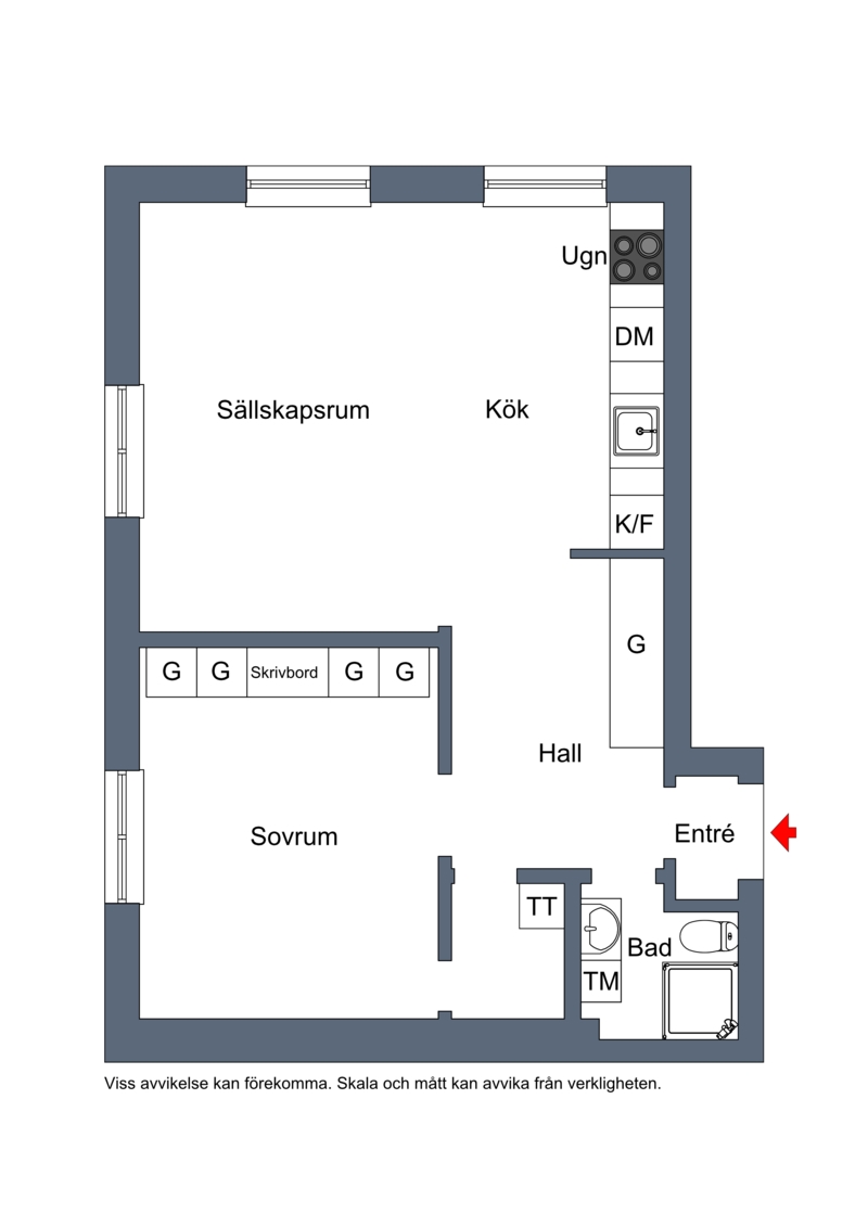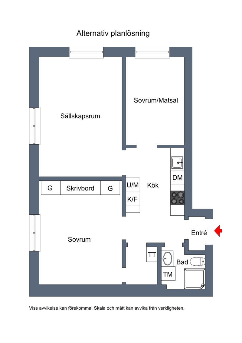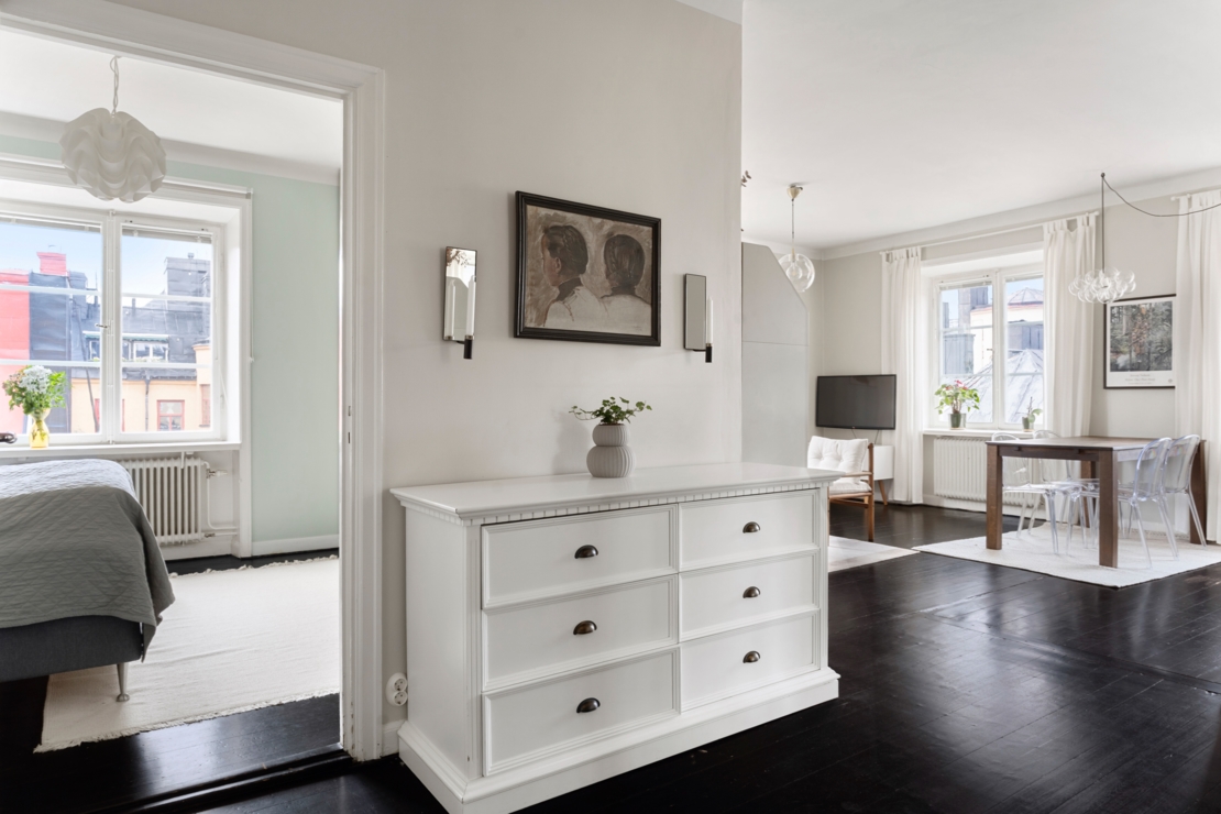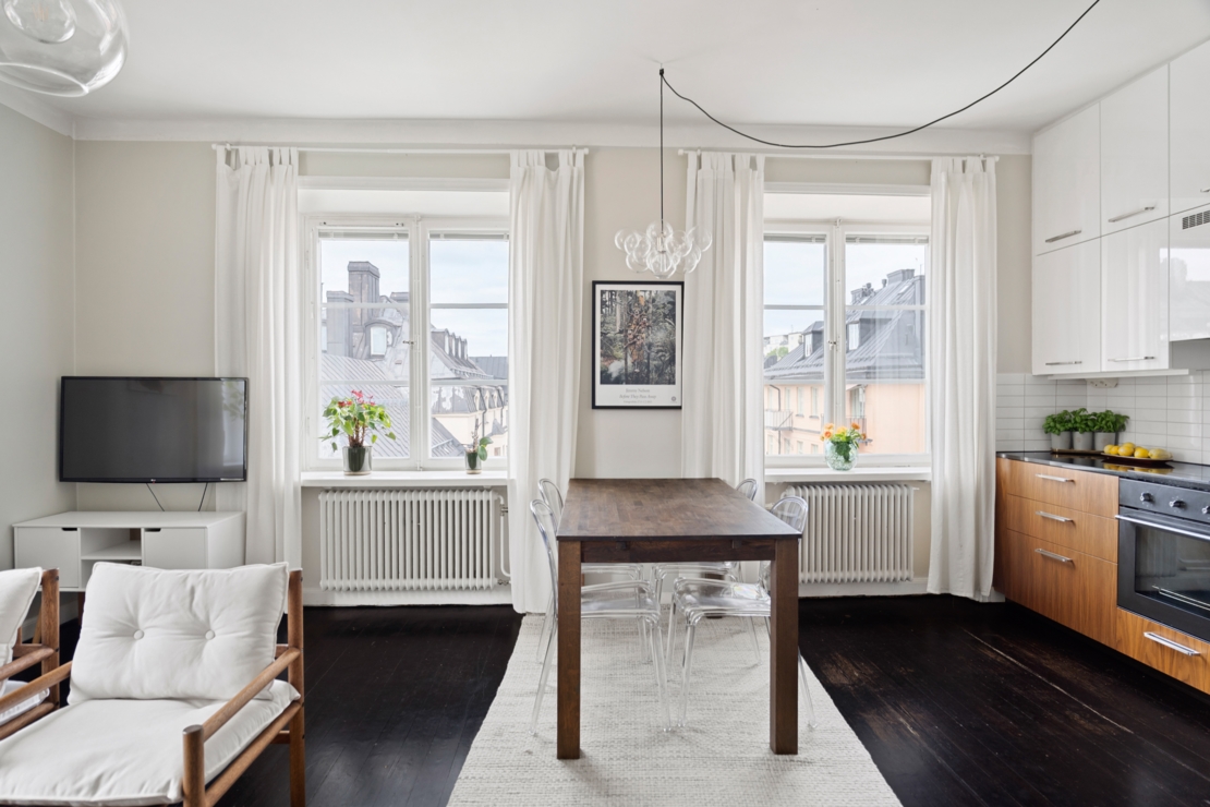 Plats för soffgrupp, förvaring, TV och ordentlig matplats.