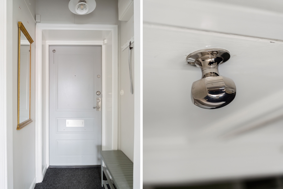 Plats för avhängning samt skohylla i förhallen och plats för mycket förvaring i inre hall.