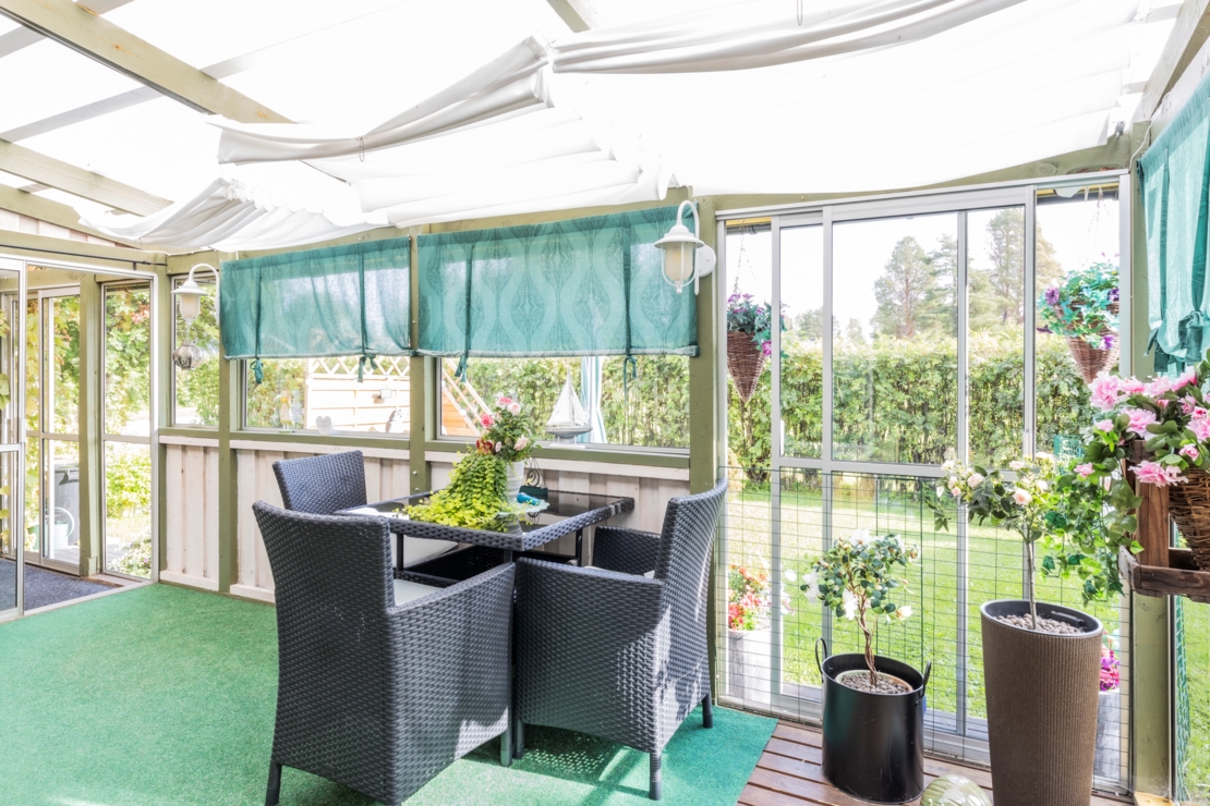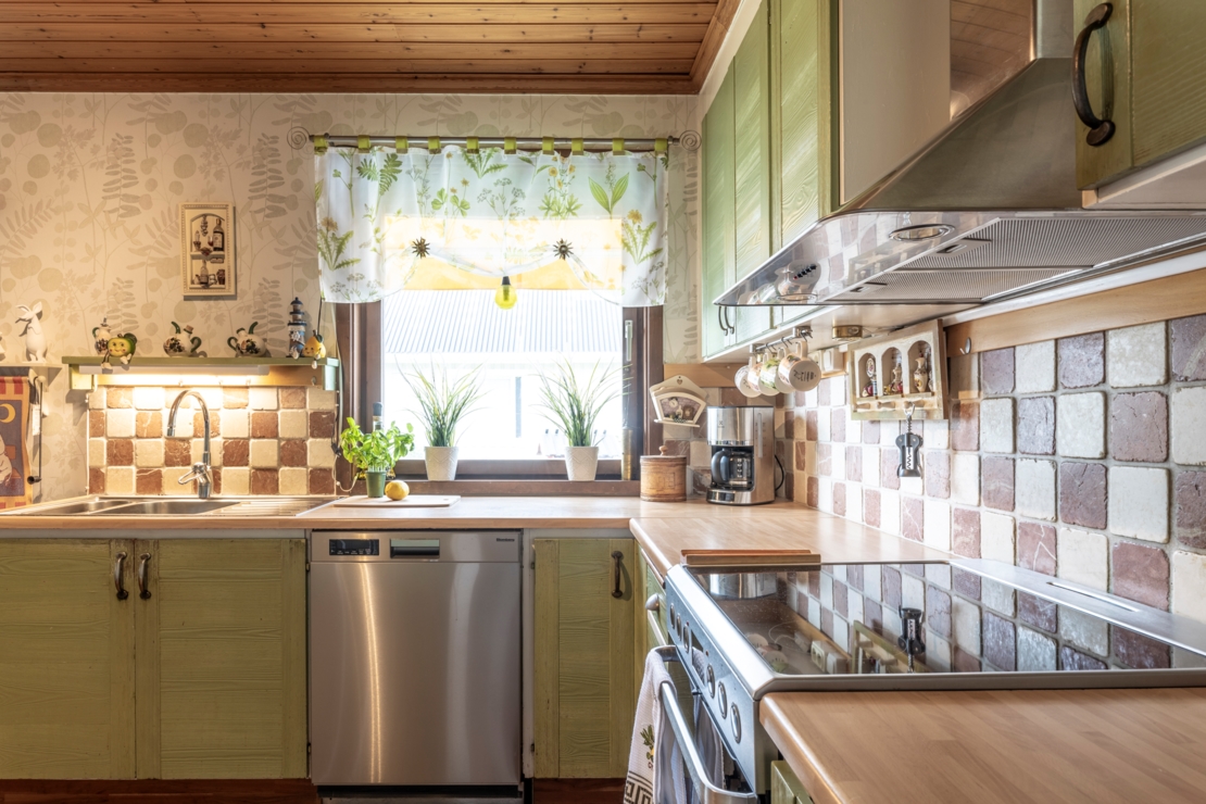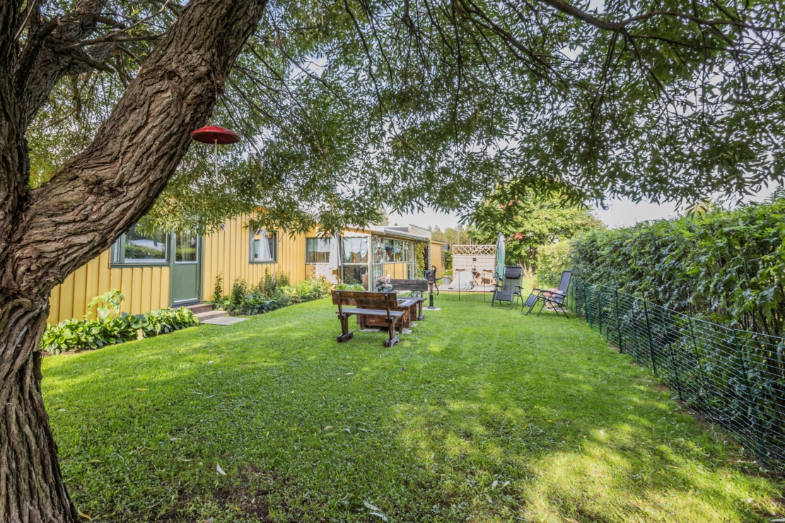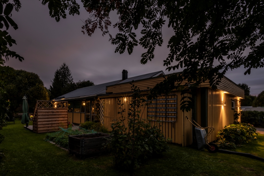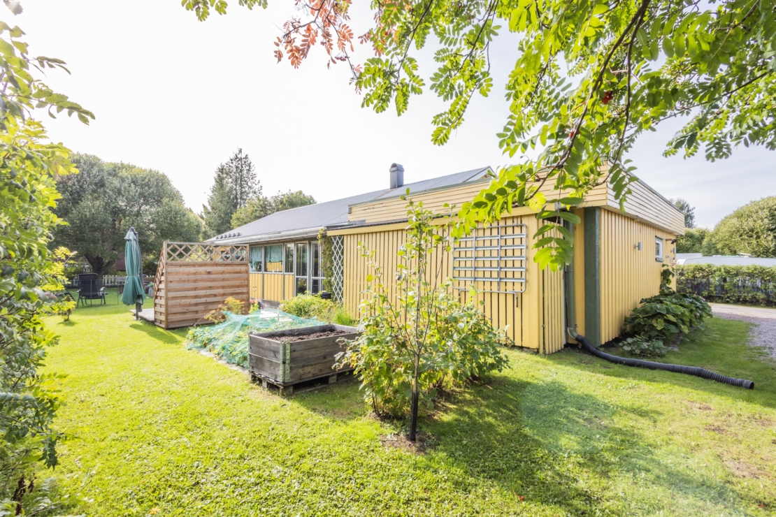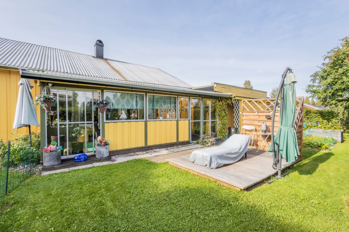 Enplansvilla med renoverade ytskikt och välvårdad trädgård.