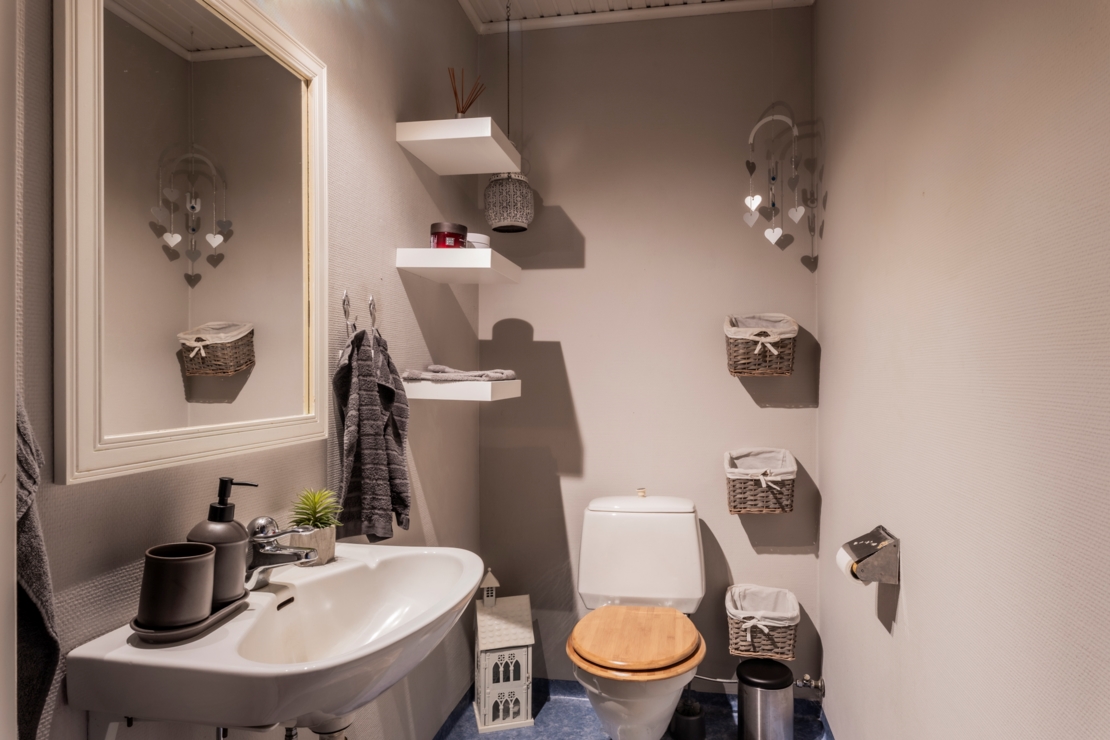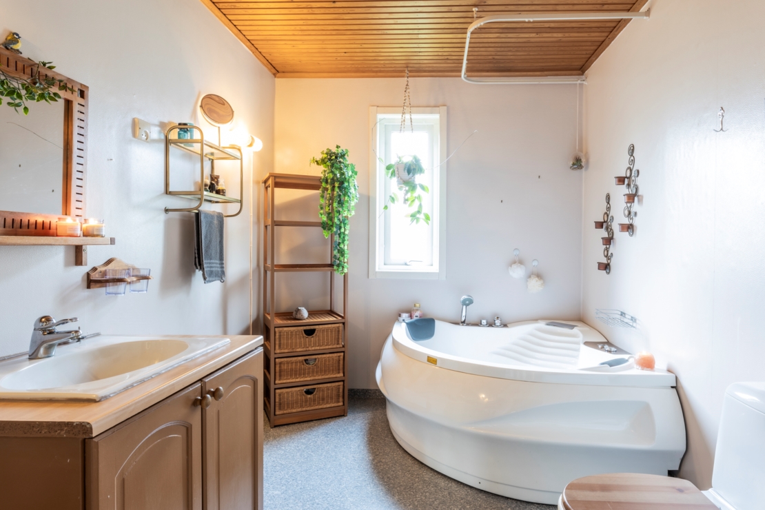 I huset finner man ett välutrustat kök med nyare vitvaror, ett rymligt vardagsrum med braskamin, tre fräscha sovrum, badrum med bubbelbadkar och toalett, gästtoalett, bastu med dusch, tvättstuga och förråd. Från vardagsrummet eller det största sovrummet nås en inglasad altan och den insynsskyddade trädgården. Här finns grillplats, solaltan, jordgubbsland, hallon- och vinbärsbuskar, äppelträd och många olika sorters blommor. På husets baksida finns ett vedförråd och ett fristående trädgårdsförråd.