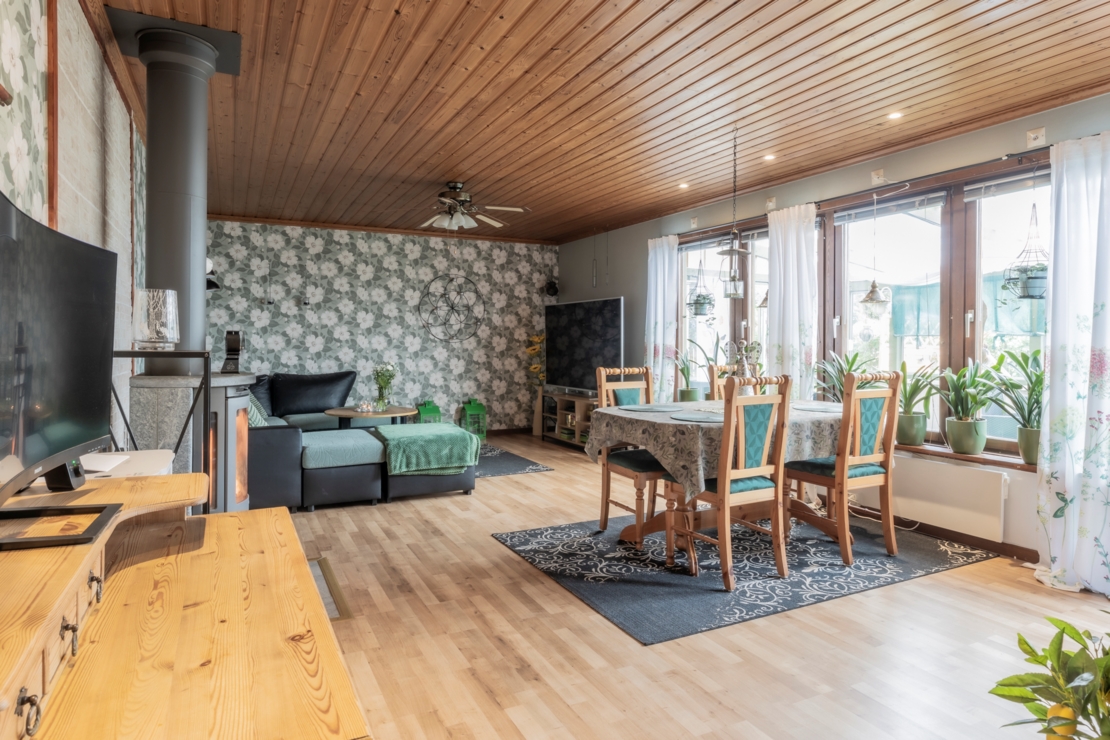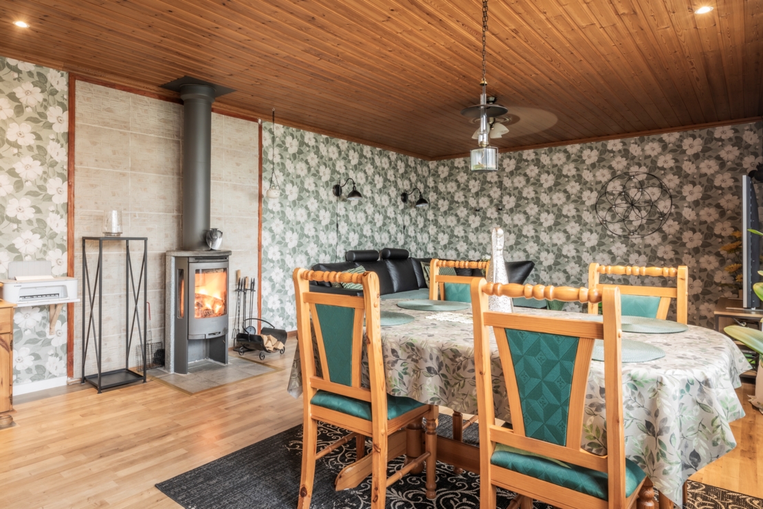 Huset värms upp med luftvärmepump, vedkamin och oljefyllda element. Fiber är indraget.