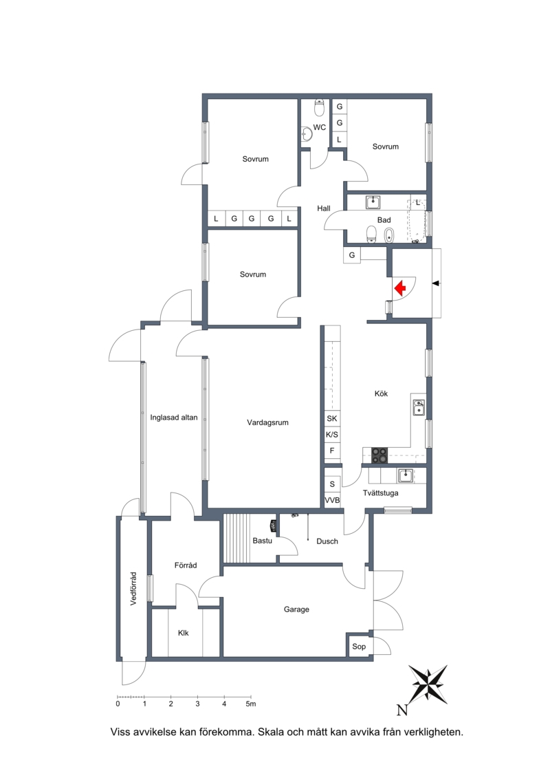 Det finns även ett vidbyggt varmgarage med elport. Huset är utrustat med fasadbelysning.