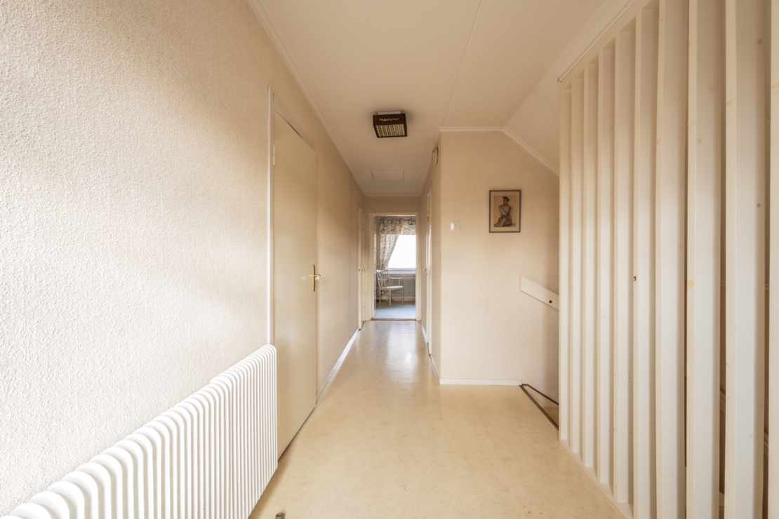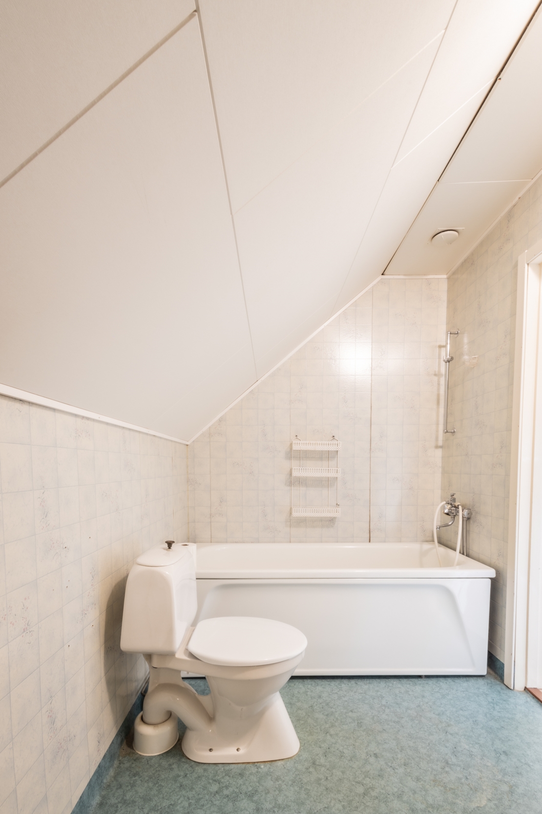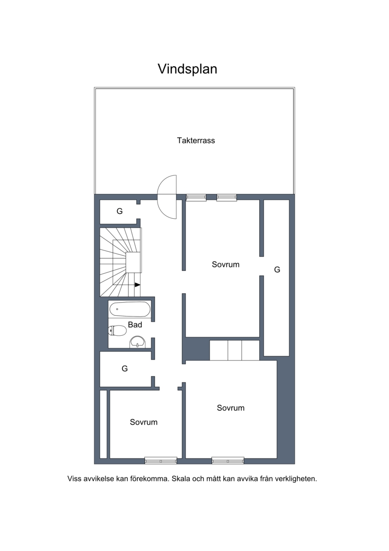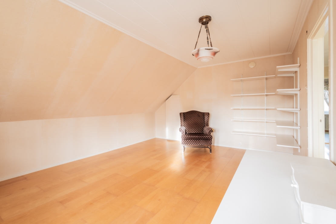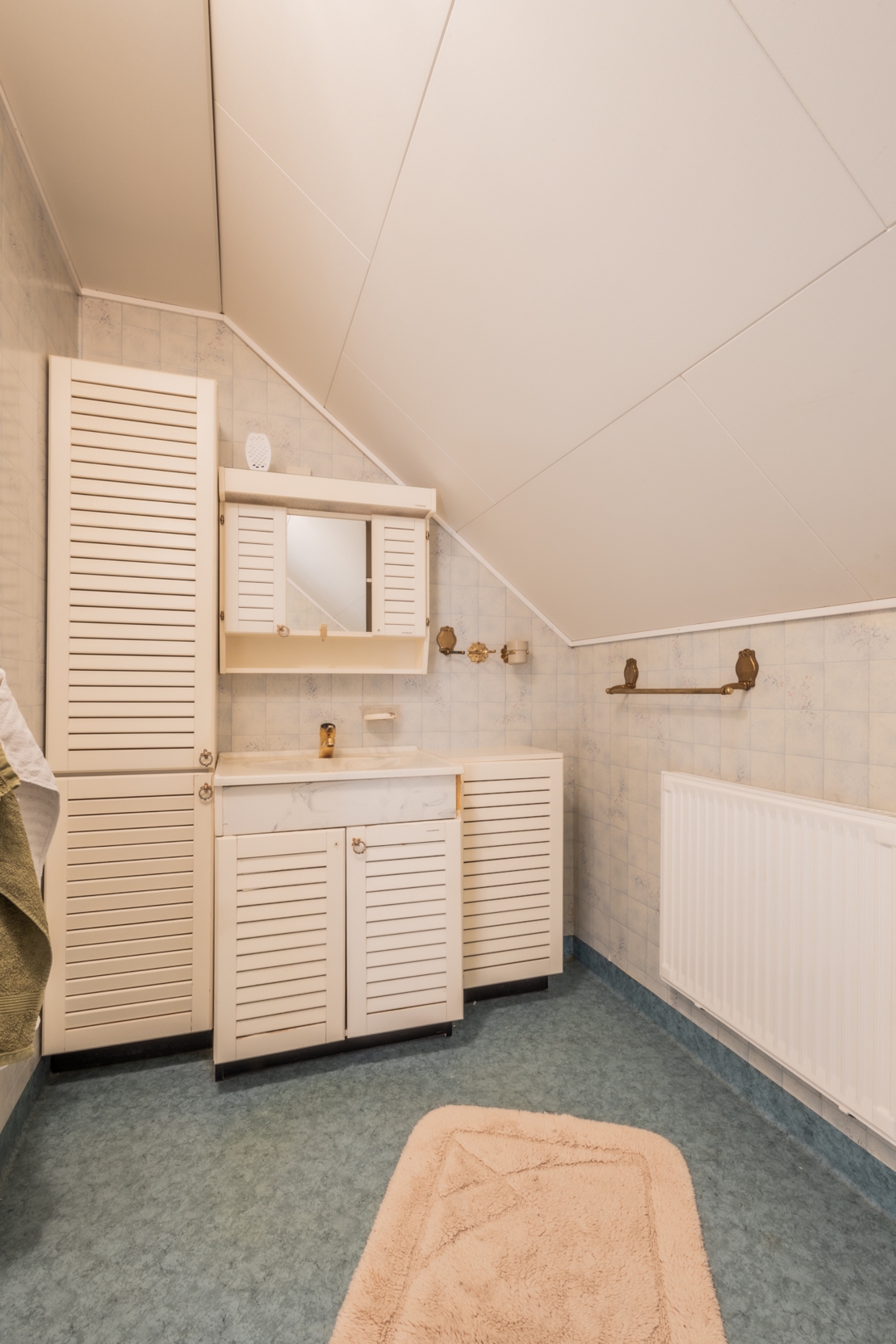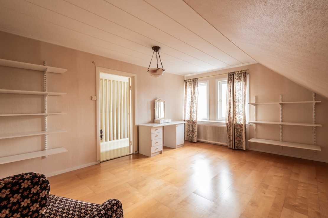 Övre plan rymmer ytterligare tre sovrum samt ett badrum med badkar och toalett. Det finns även möjlighet att bygga en stor takterrass här. Ett praktiskt tvättnedkast i hallen leder till källaren där tvättstugan finns.