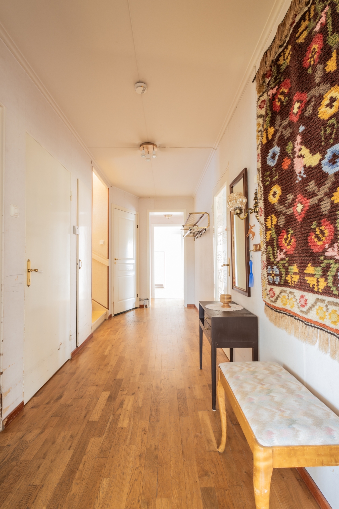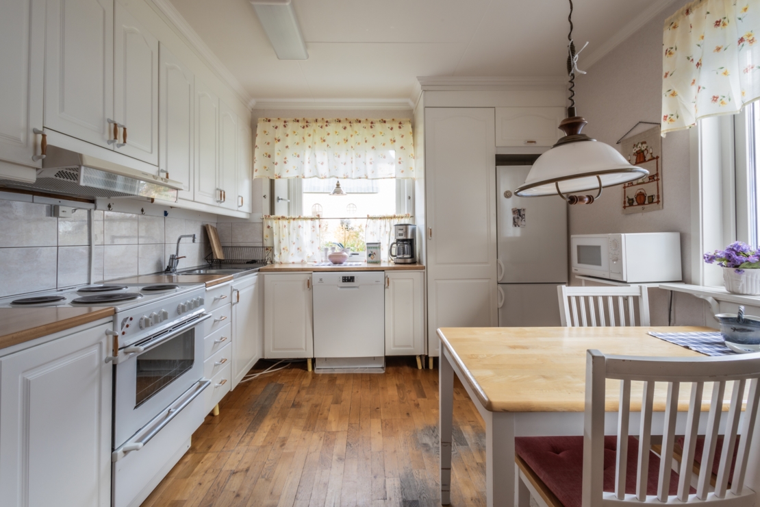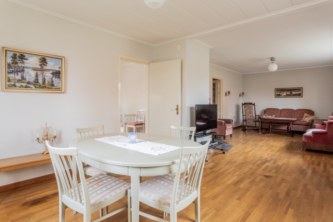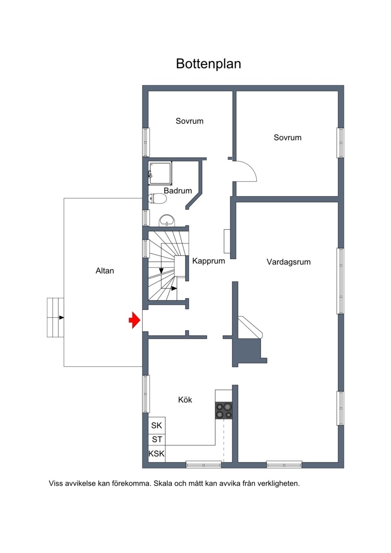 På entréplan finner du ett ljust och välutrustat kök, ett rymligt vardagsrum med braskamin (OBS! ej besiktad), två trevliga sovrum samt ett stort, handikappanpassat badrum med dusch och toalett. En ny duschkabin är redan inköpt, men behöver installeras.