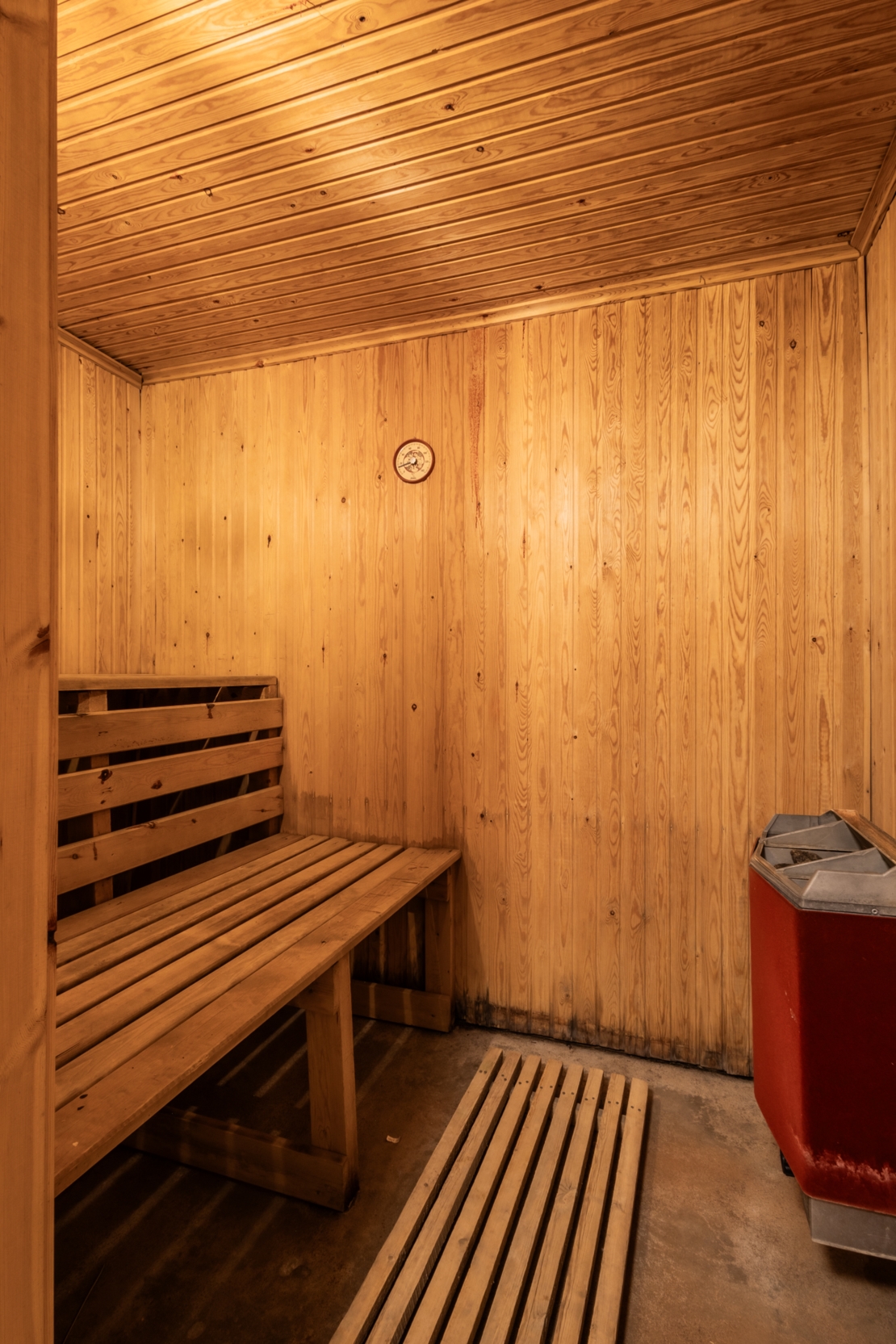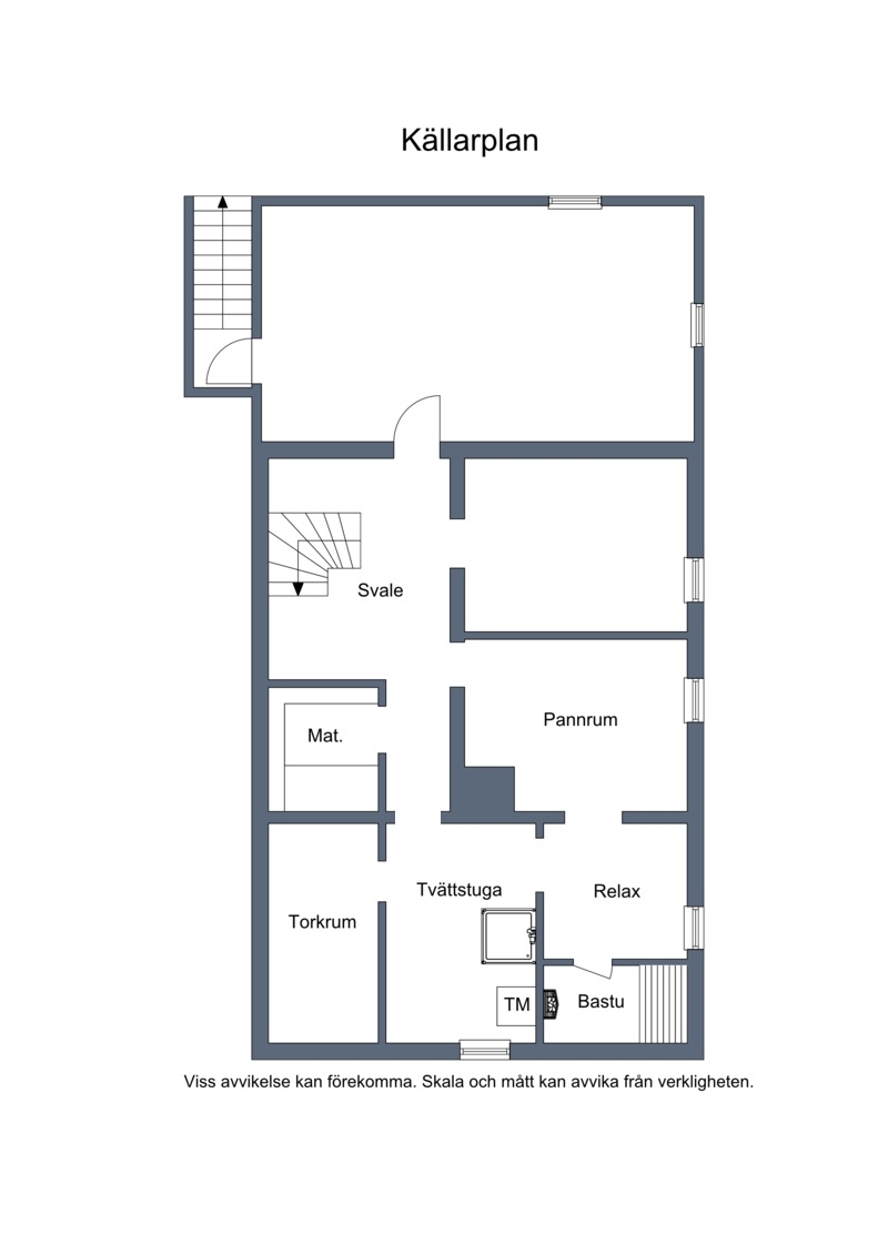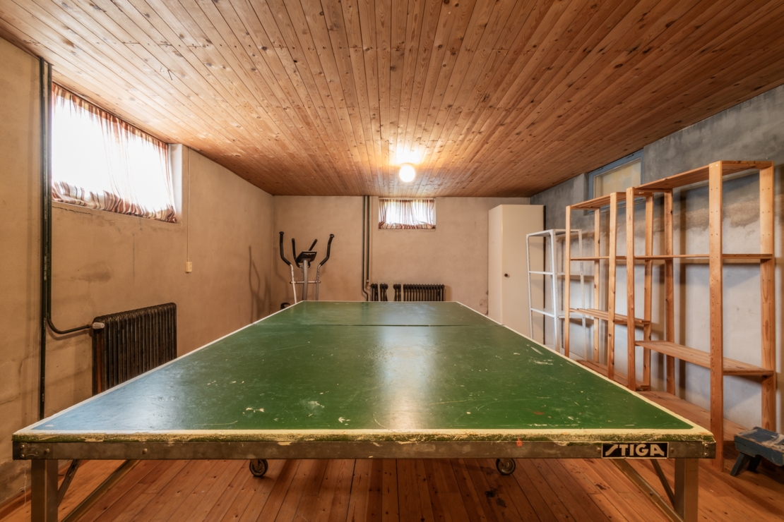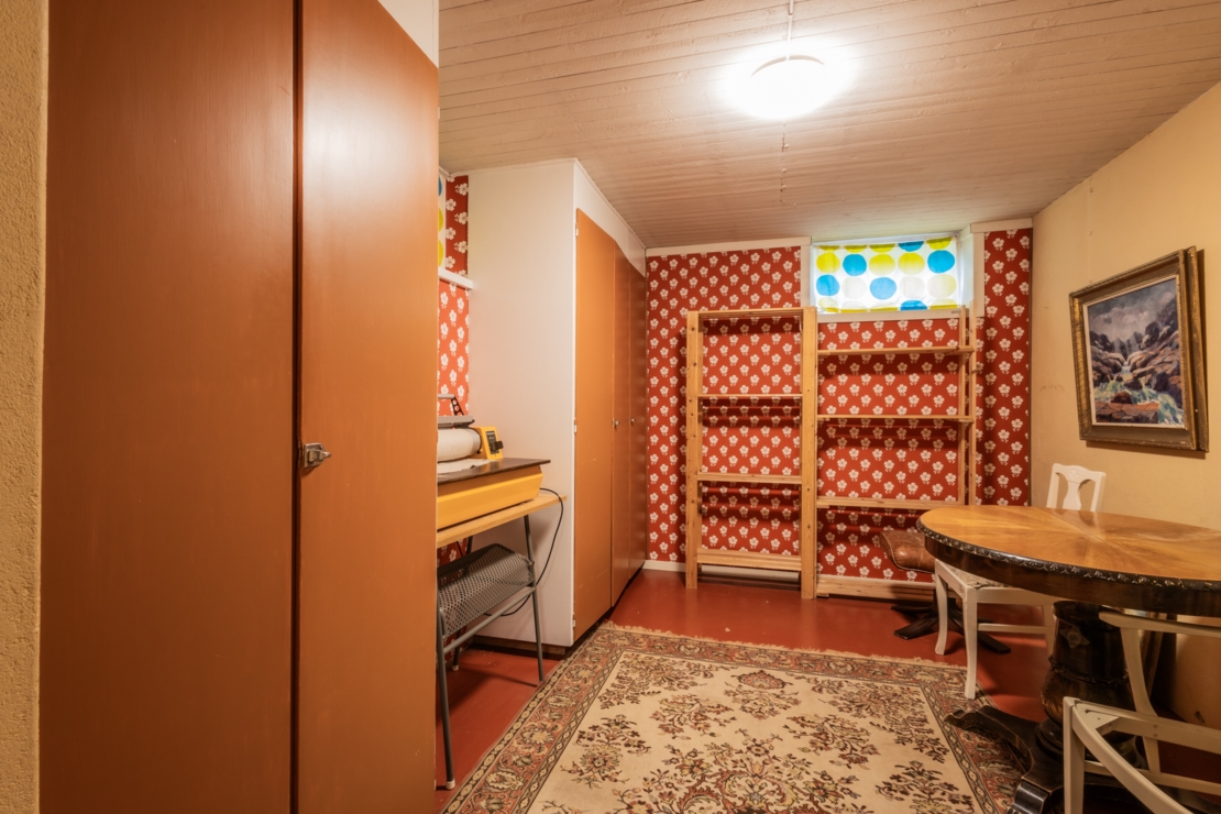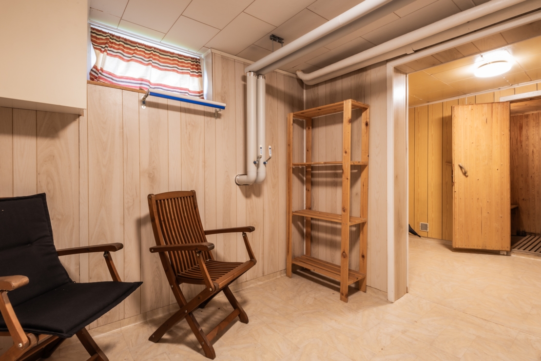 Den inredda källaren erbjuder bastu, dusch, tvättstuga, torkrum, pannrum samt ett förråd och ett generöst hobbyrum – perfekt för fritidsaktiviteter och förvaring.