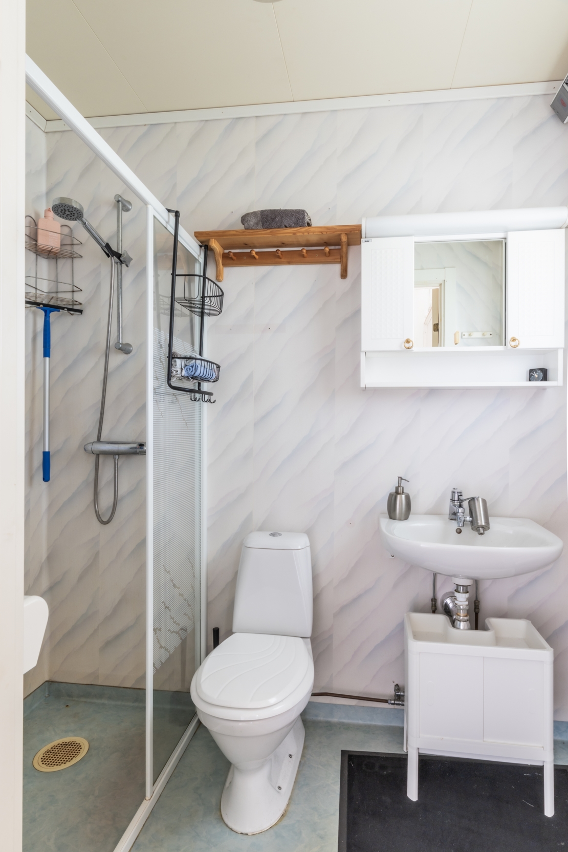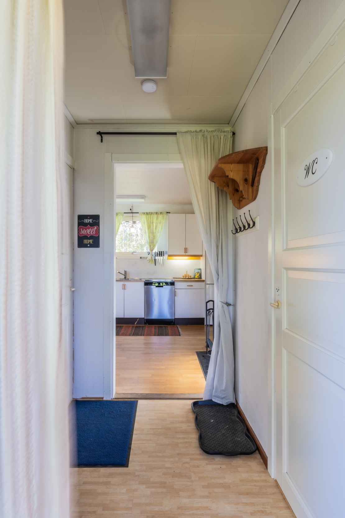 På bottenplan finner man ett välutrustat kök med kyl/frys, diskmaskin samt en öppen spis som ger både värme och trivsel åt hela huset. I anslutning ligger ett rymligt vardagsrum och ett badrum med dusch och toalett.