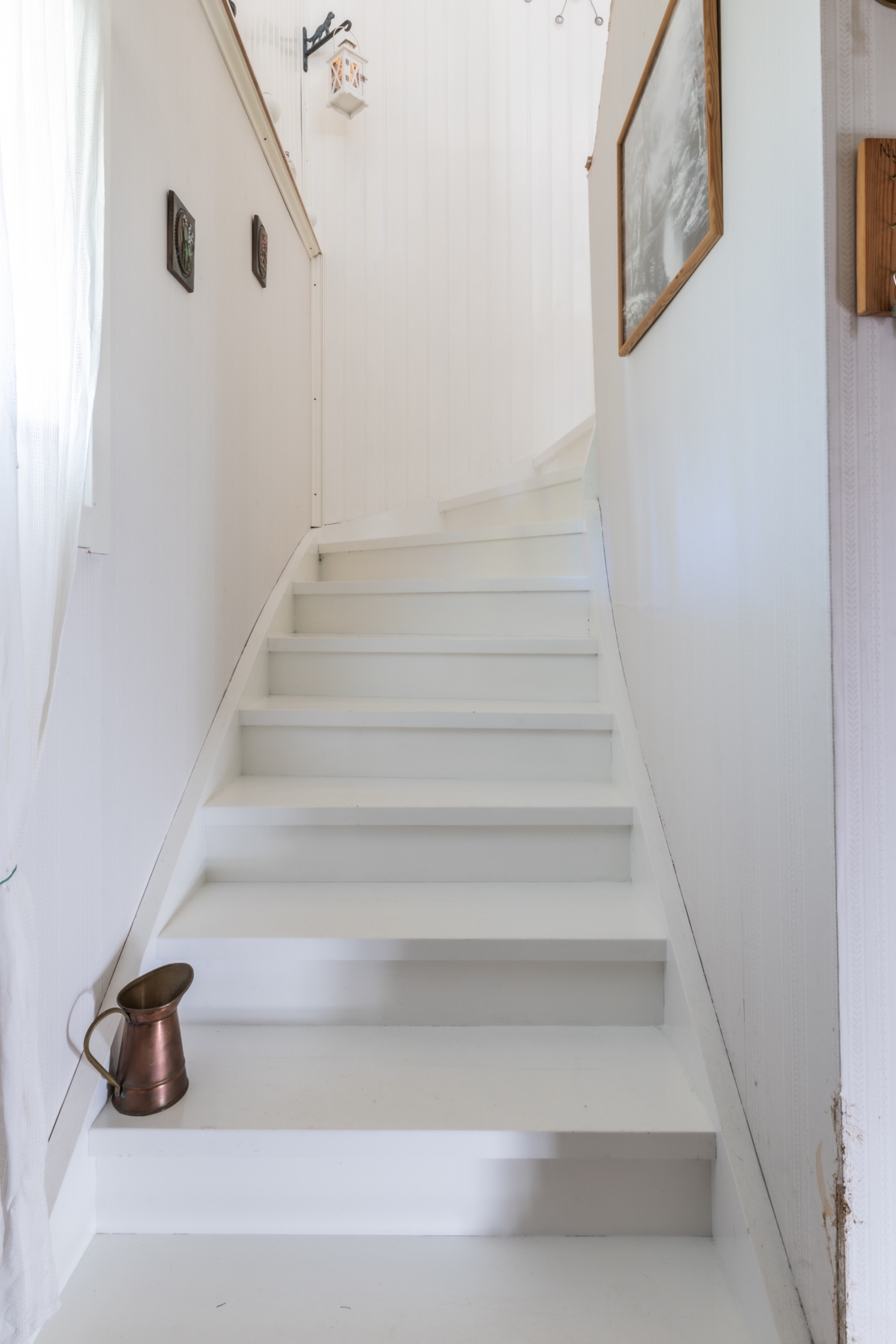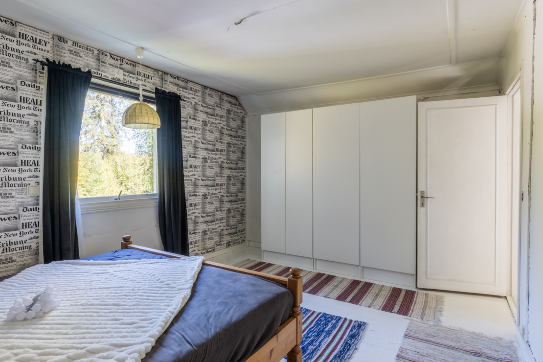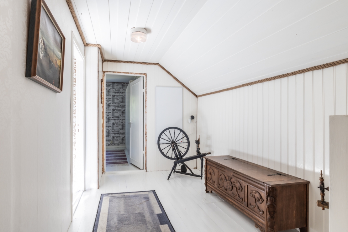 På övre våningen finns två stora sovrum och en hall med goda möjligheter till förvaring eller möblering.
