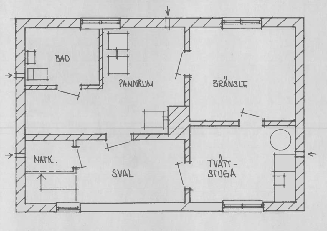I källaren finns tvättstuga, pannrum och generösa utrymmen för förvaring. Här behöver källargolvet delvis gjutas igen efter tidigare avloppsarbete och en viss fuktighet har observerats, vilket gör att dränering rekommenderas.