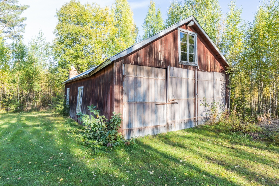 På den stora tomten står en äldre lada i behov av översyn men med plats för flera fordon som bil, traktor eller husbil.