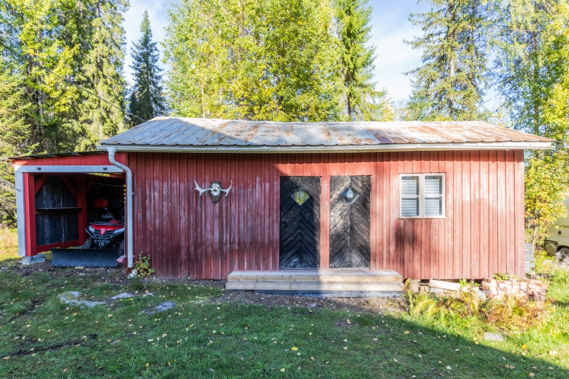 Här finns även en mindre byggnad med indragen el som rymmer förråd/verkstad, vedförråd samt en mindre carport med plats för exempelvis cykel eller skoter.