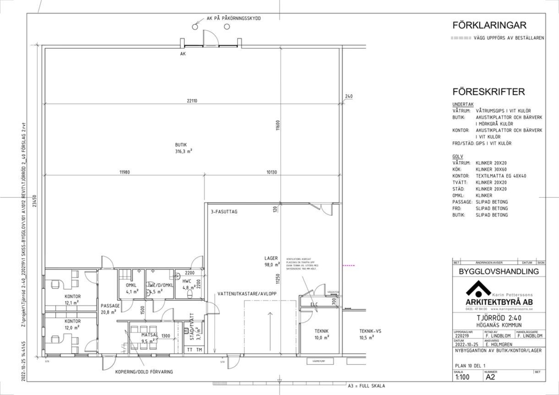Lokalen omfattar en butiksyta på 314 kvm med en takhöjd på 9 meter, ett lager på 110 kvm med en högport på cirka 6 meter, samt en kontorsdel på 73 kvm som inkluderar två kontor, kök, toalett och omklädningsrum. Dessutom finns en separat kundtoalett i butiksdelen. Lokalen är tillgänglig för omedelbart tillträde.
