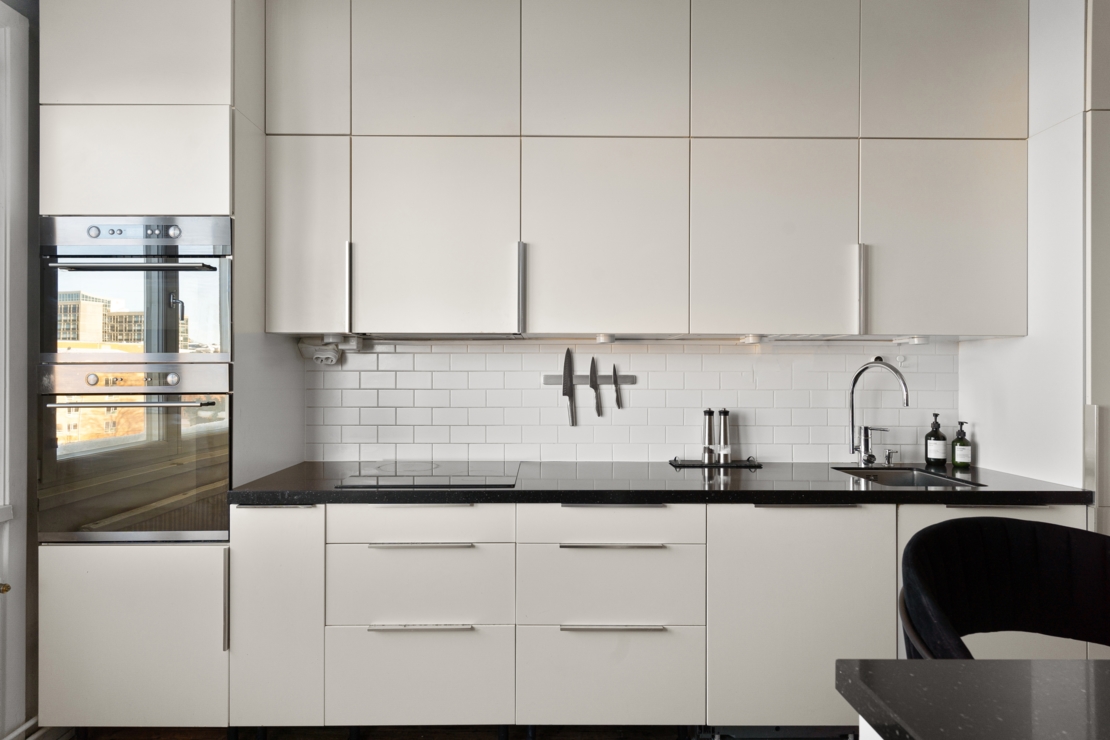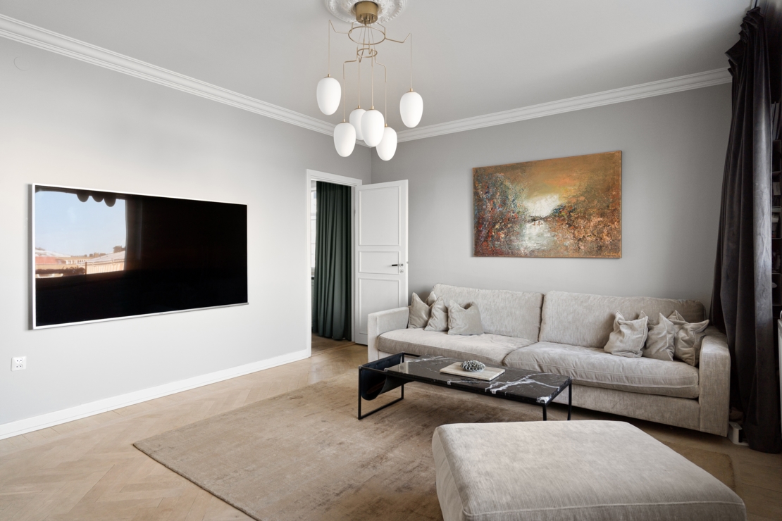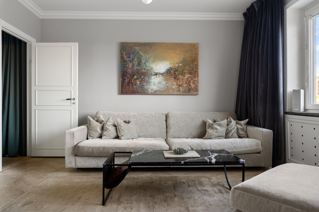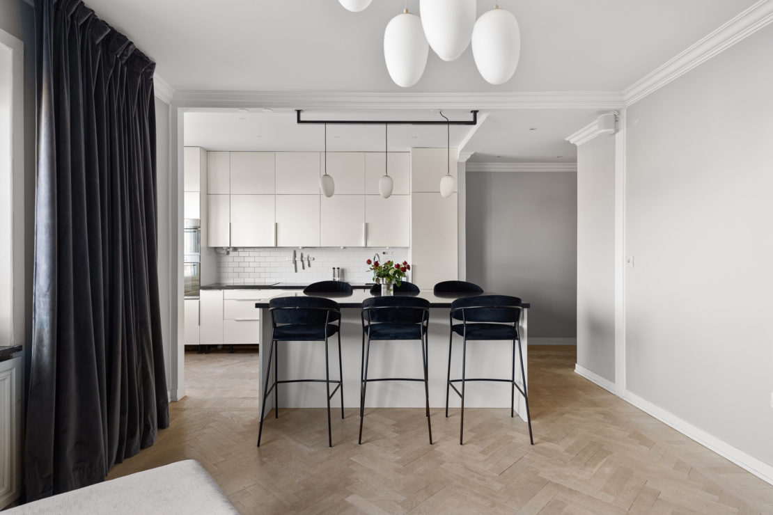 Den öppna planlösningen mellan kök och vardagsrum skapar en härlig känsla av rymd och gör lägenheten perfekt för både vardagsliv och sociala tillställningar. Köksön blir den självklara samlingsplatsen vid middagar och bjudningar. Från den soliga balkongen har du en plats för avkoppling med utsikt över stadens takåsar.