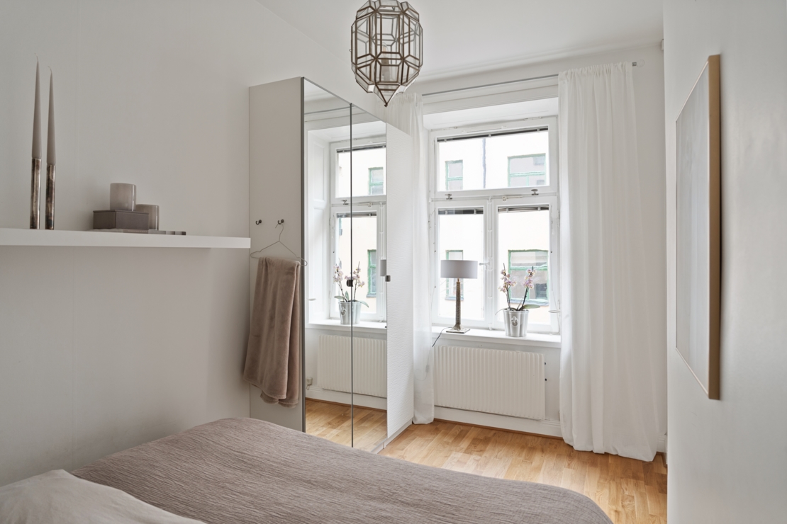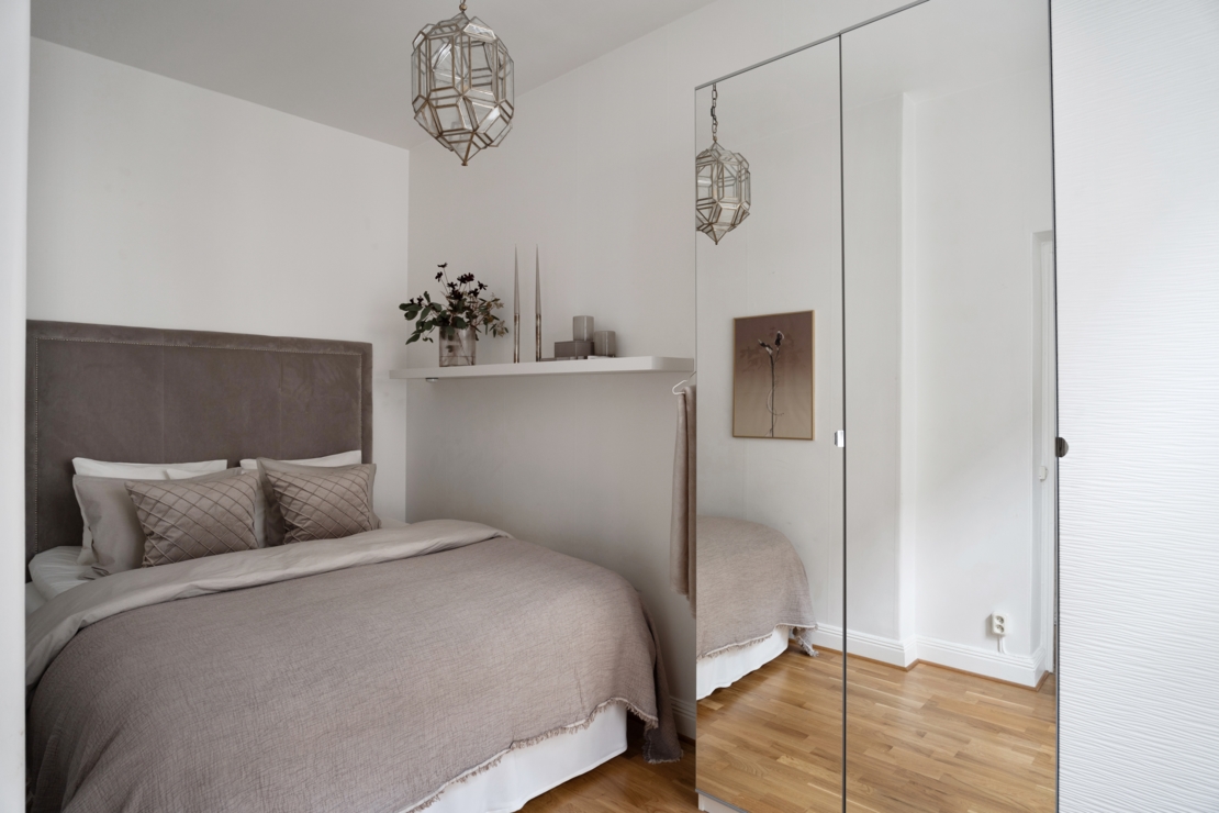 Rofyllt sovrum med plats för stor säng, skrivbord och förvaring