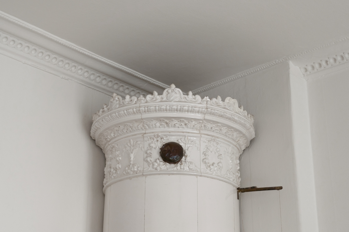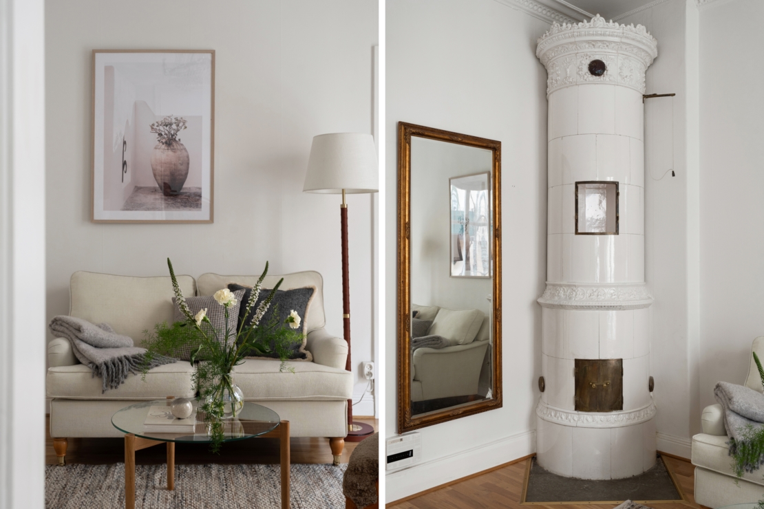 Väl tilltaget vardagsrum med plats för soffgrupp med tillhörande möblemang och en vacker kakelugn. Från vardagsrummet nås bostadens balkong som förlänger sällskapsytan ytterligare.