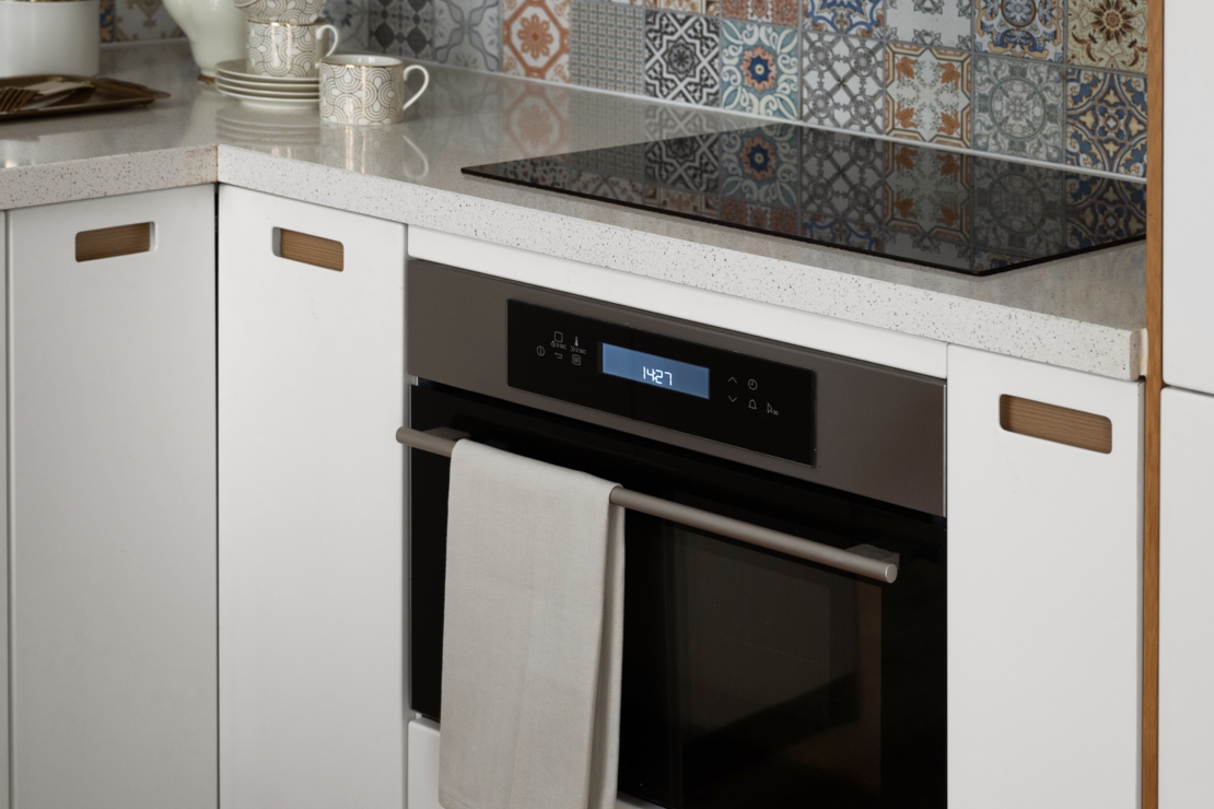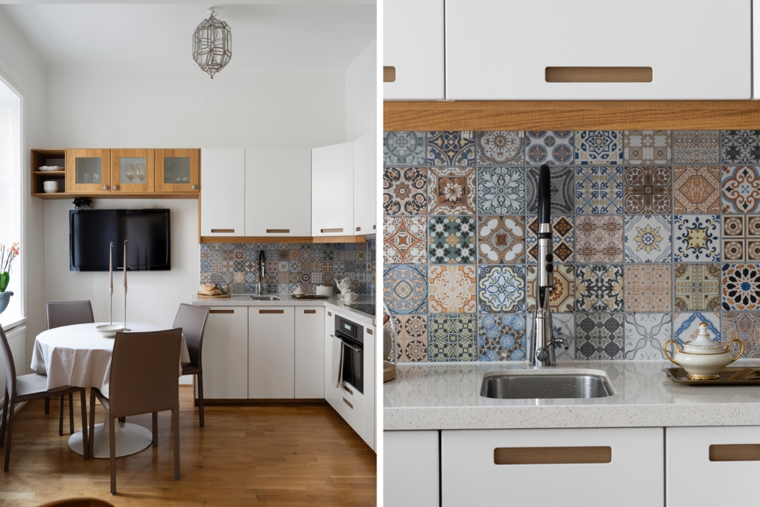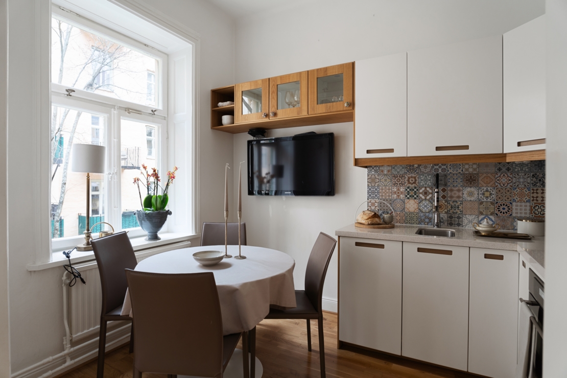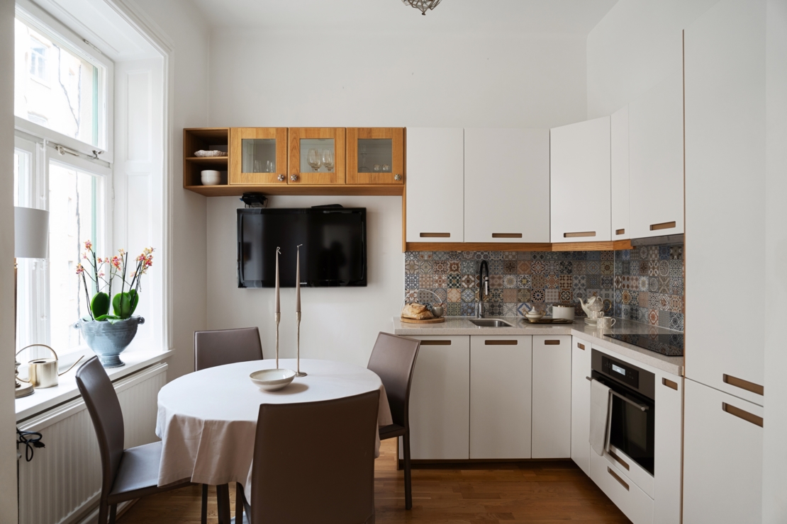 Stilrent kök med ljusa skåpluckor och kakel ovanför ljus arbetsbänk. Köket är maskinellt utrustat med induktionshäll, ugn, integrerad diskmaskin samt kyl/frys. Plats för matbord för sällskap om ca 4 personer.