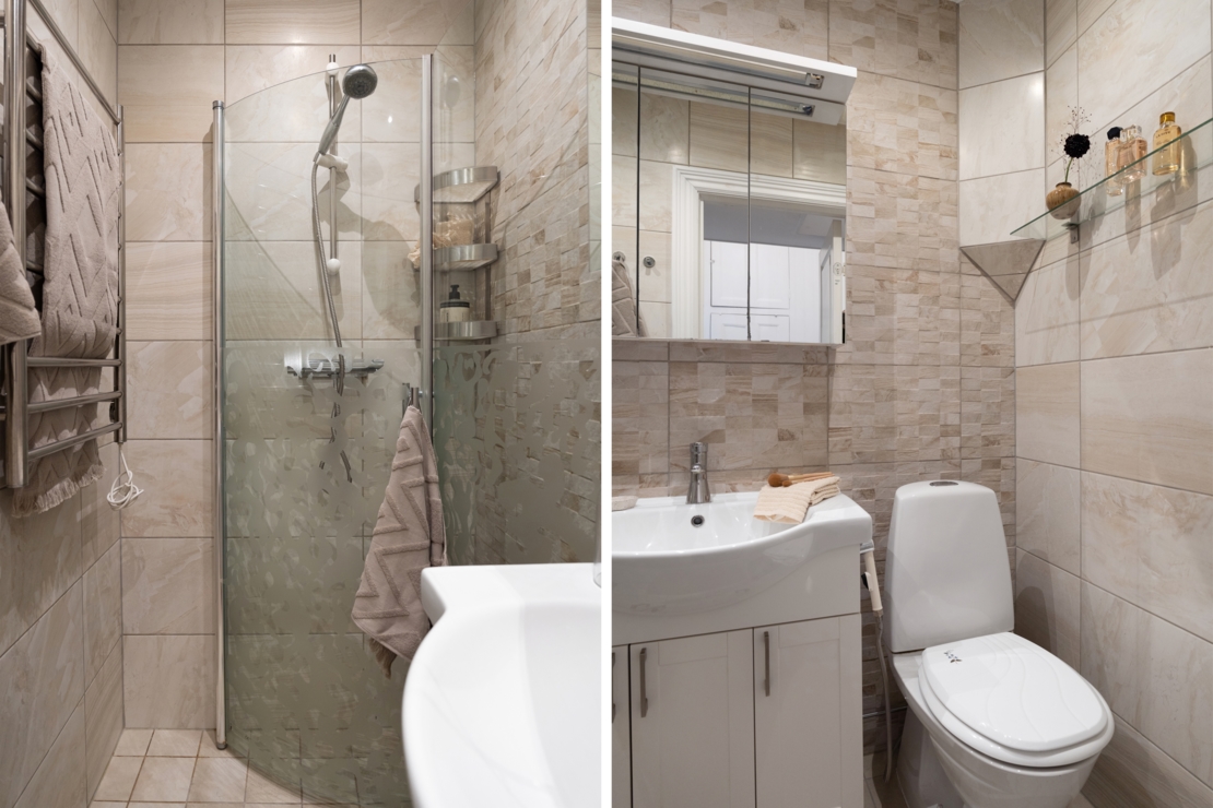 Helkaklat badrum inrett med wc, tvättställ med kommod, handdukstork, dusch med vikbara glasväggar samt förvaring i överskåp. Infällda spotlights i tak.