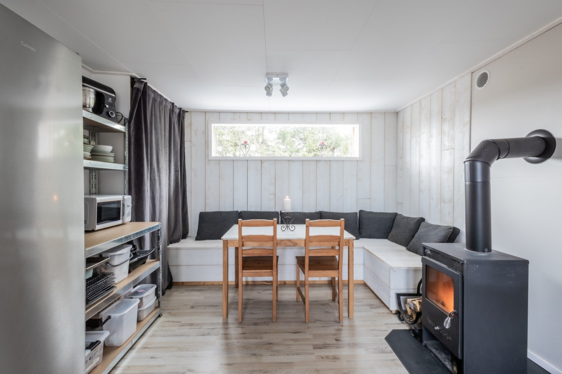 Byggnaden är inredd med ett allrum med vedkamin och kök på bottenvåningen, samt två sovkammare och ett badrum med dusch och mulltoalett på loftet.
