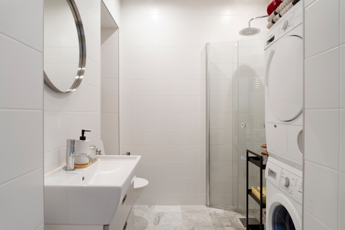 Här möts du av en genomtänkt planlösning som maximerar varje kvadratmeter. Köket är fullt utrustat med integrerade vitvaror, inklusive diskmaskin och lyxiga materialval i sobra färger. Det stilrena badrummet är helkaklat och är inrett med dusch och en praktisk tvättpelare. Sovdelen är smart avskild och ger en naturlig plats för vila.