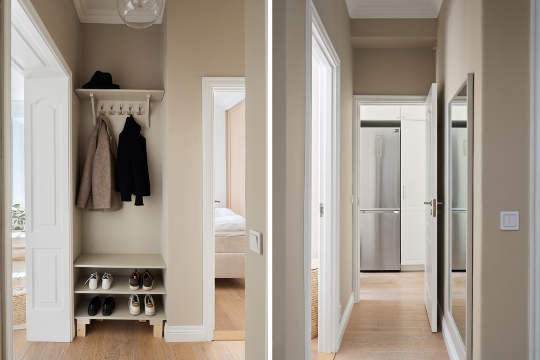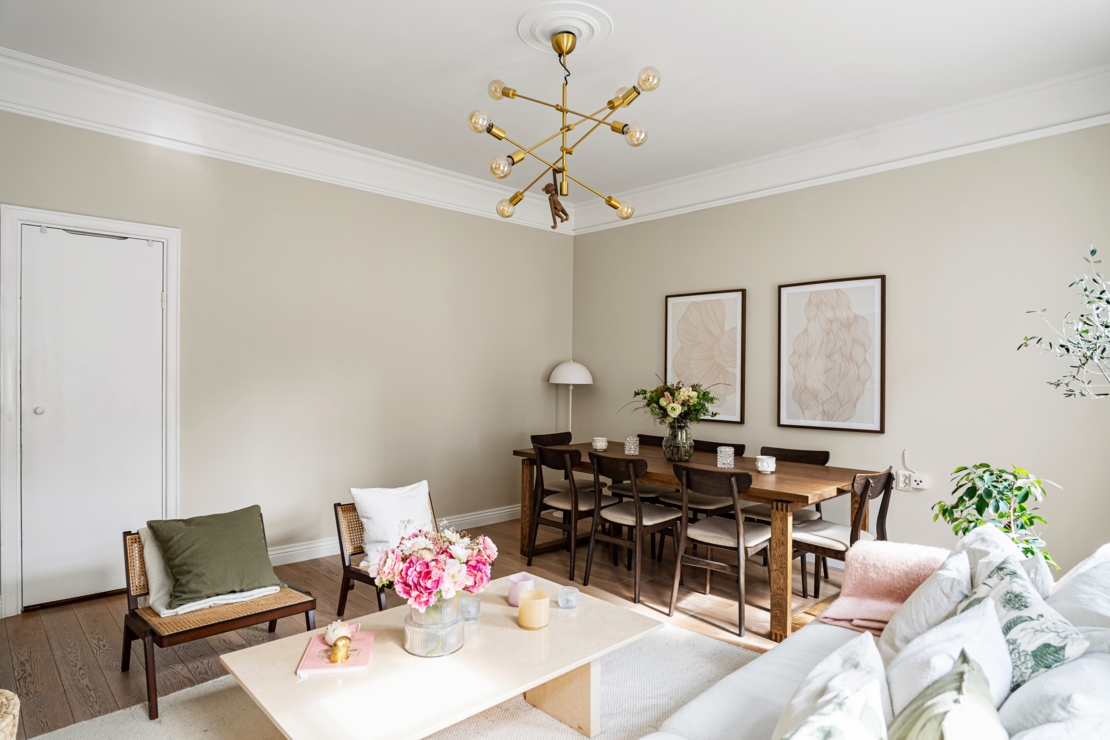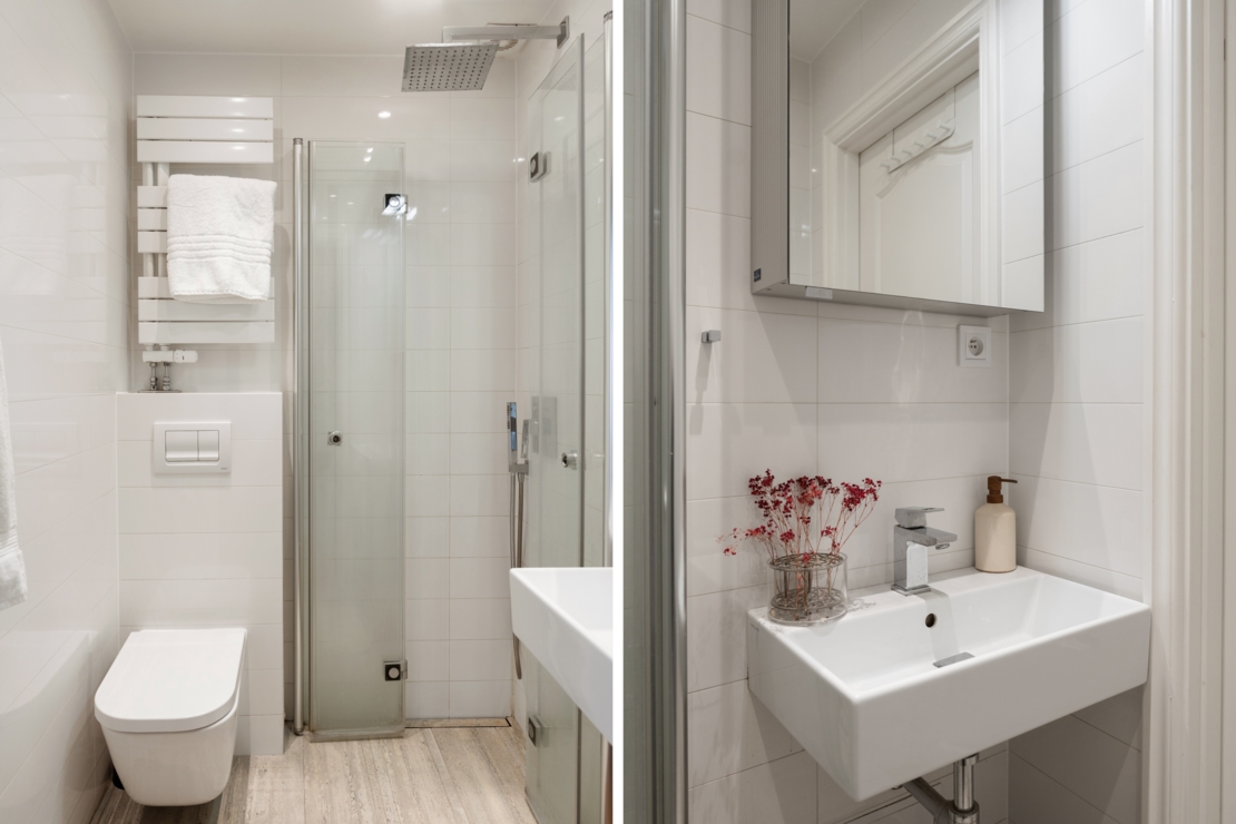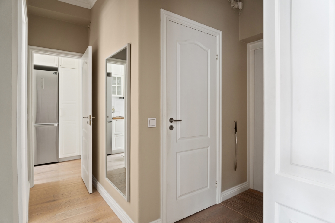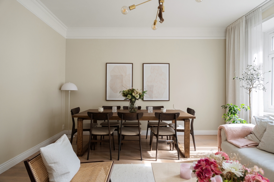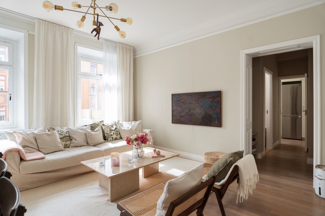 Lägenheten är exceptionellt planerad med bra ljusinsläpp och en smart disposition som maximerar utrymmet. Vardagsrummet är bostadens själ – ett inbjudande och rymligt rum där du enkelt får plats med både en ordentlig middagsyta och en större soffgrupp. Här finns gott om utrymme för långa middagar med vänner, filmkvällar eller bara lugna stunder med en bok. Rummets layout gör det enkelt att skapa flera funktionella zoner, samtidigt som det behåller sin öppna och sociala karaktär.