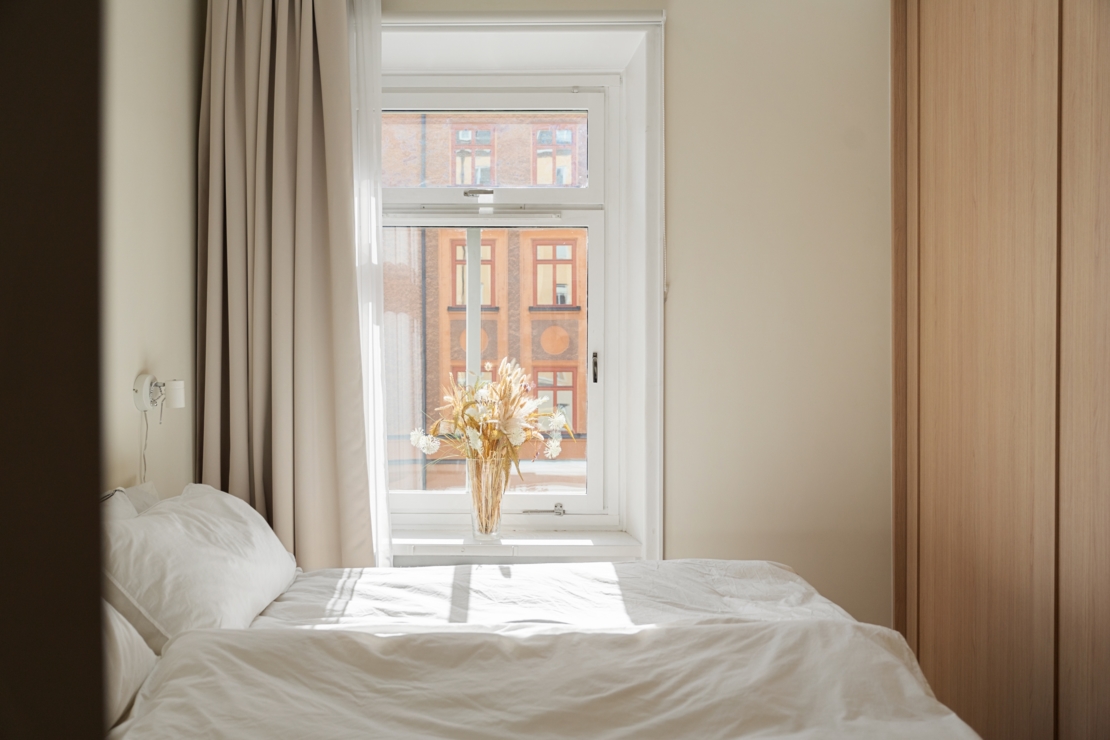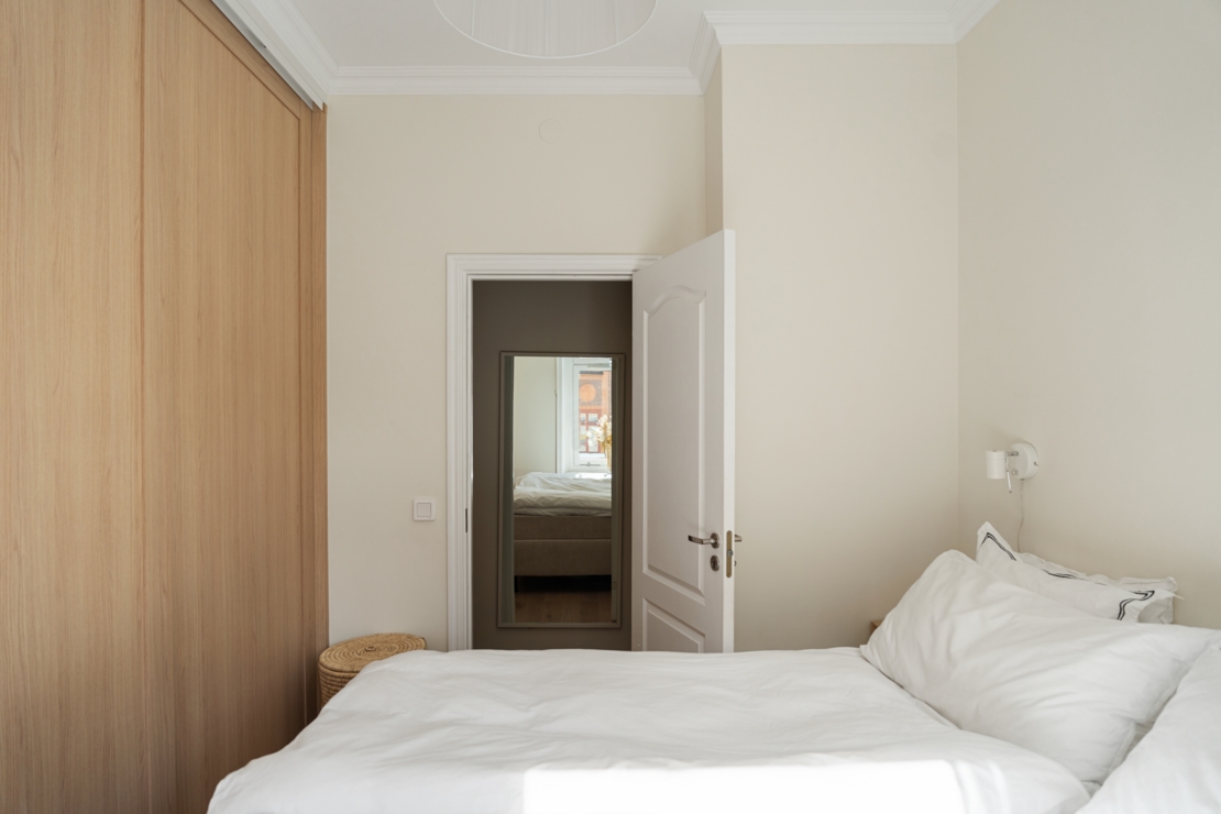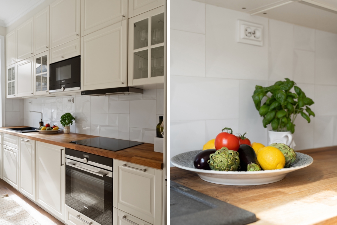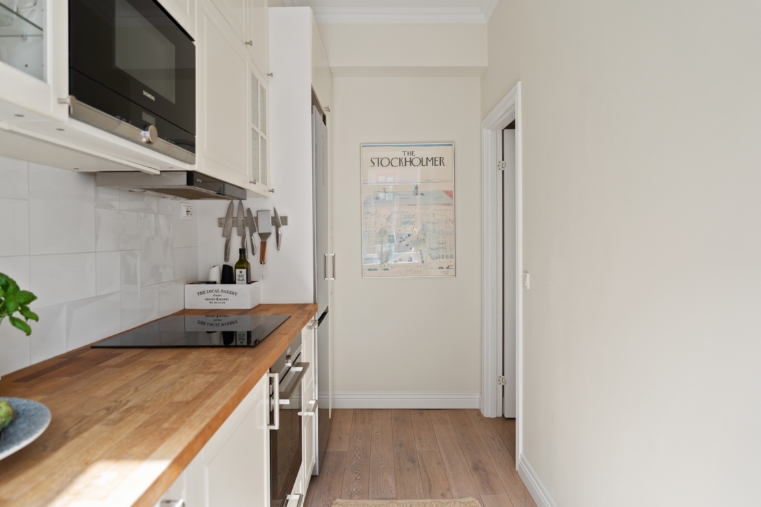 Köket är fullt utrustat – perfekt för både vardagsmatlagning och middagsbjudningar. Sovrummet är lugnt och rofyllt, med bra förvaring och plats för en större säng och har en platsbyggd garderob för smart och stilren förvaring.
