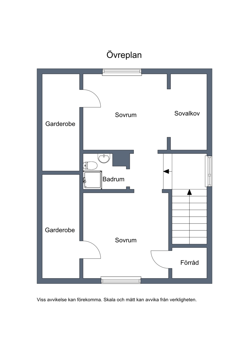 Övre plan erbjuder två sovrum med härlig utsikt genom stora fönster samt ett fräscht badrum med dusch, toalett och infällda spotlights.