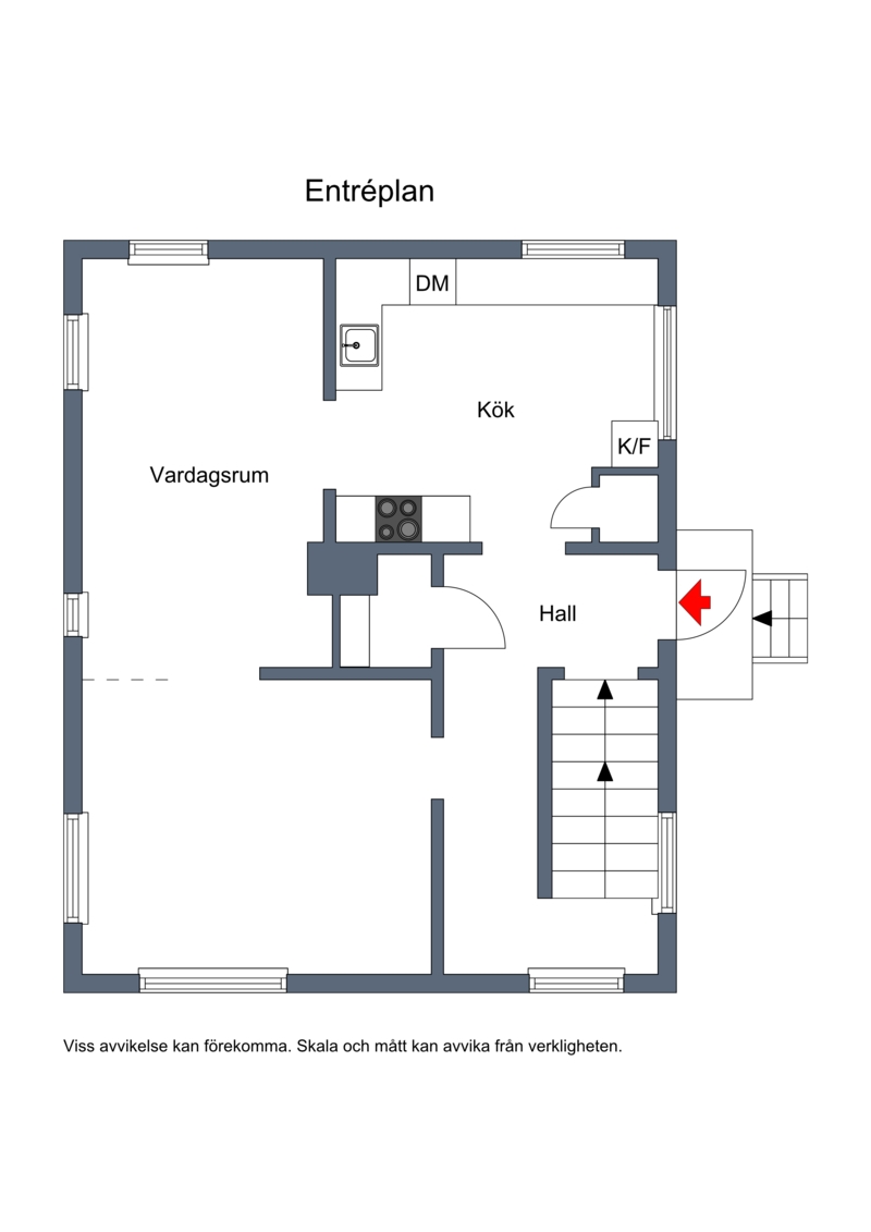 Entréplanet rymmer ett modernt och stilrent kök, ett stort och ljust vardagsrum med öppen spis och möjlighet att dela av till två rum. Vid hallen finns ett utrymme förberett för toalett.