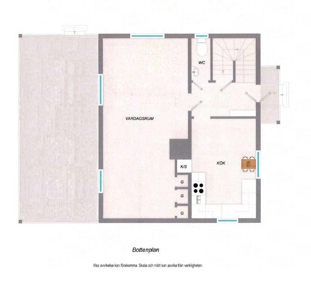 På entréplanet finns ett välutrustat kök, ett stort och ljust vardagsrum (ursprungligen två mindre rum) samt en toalett.