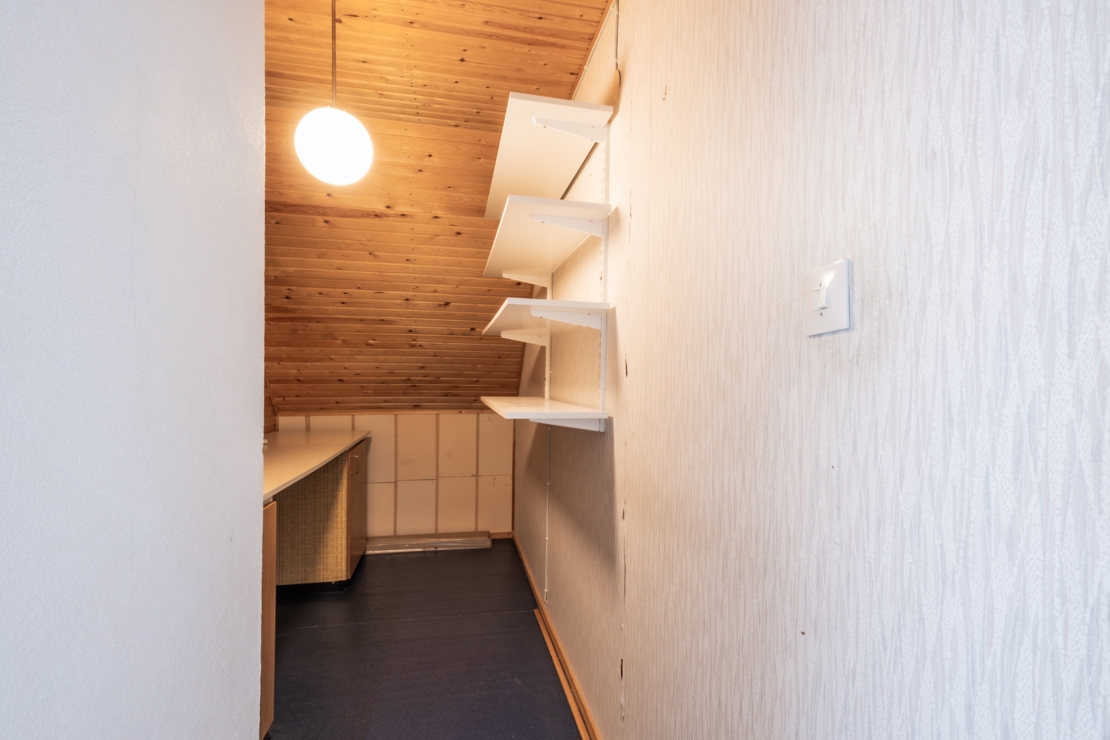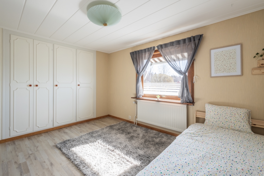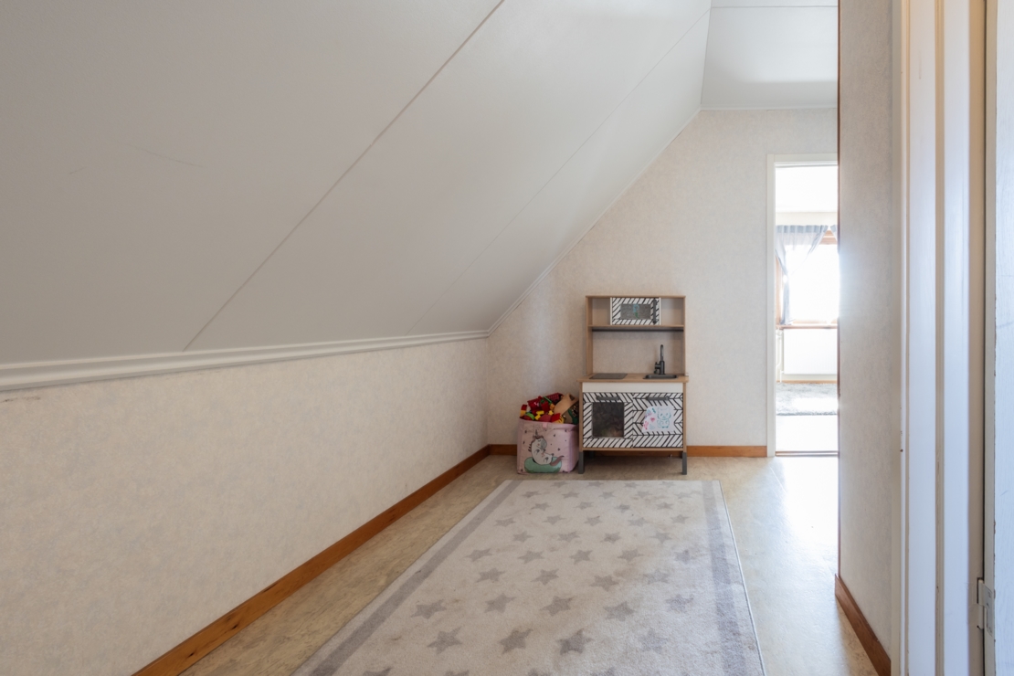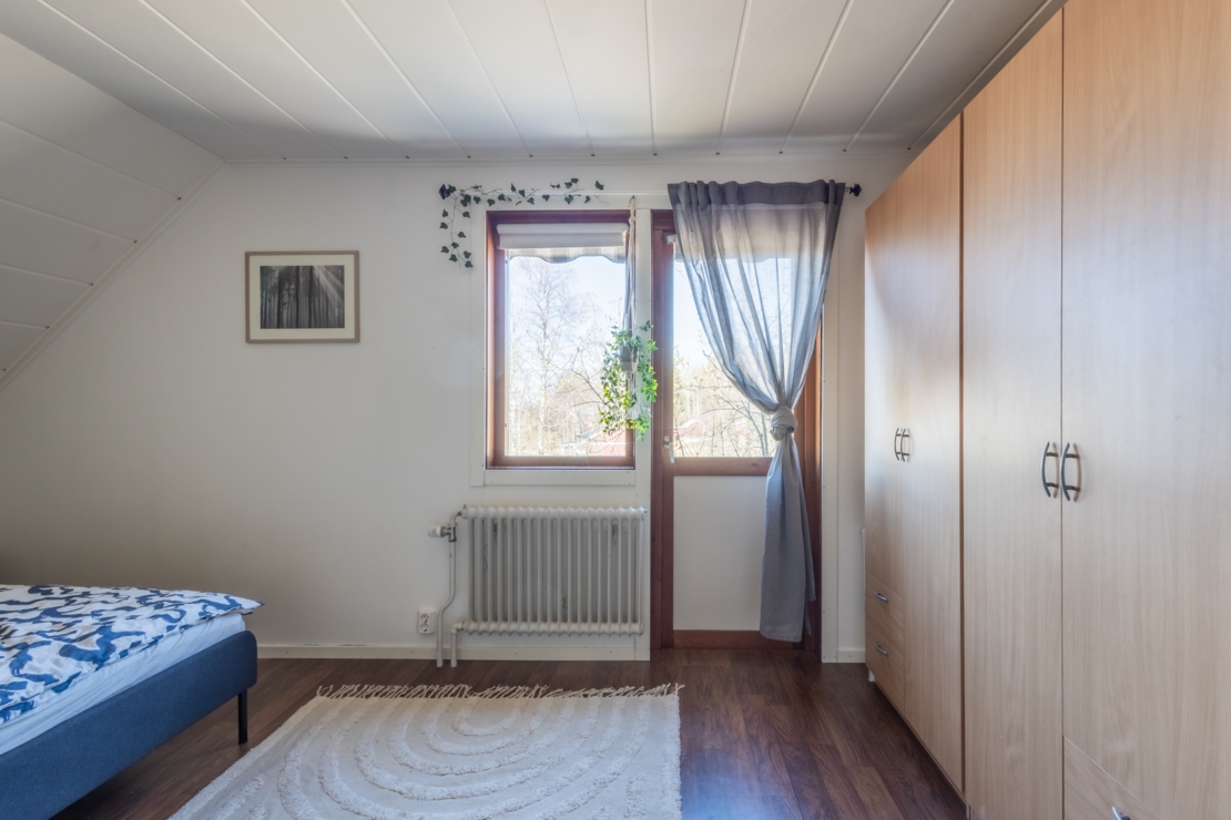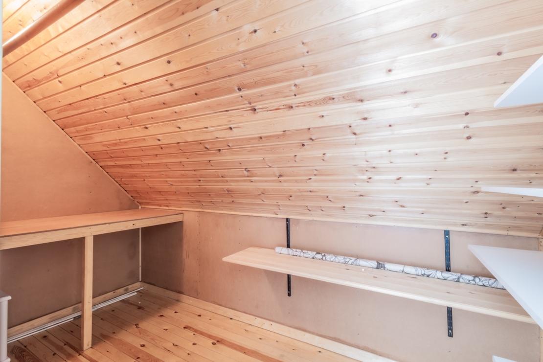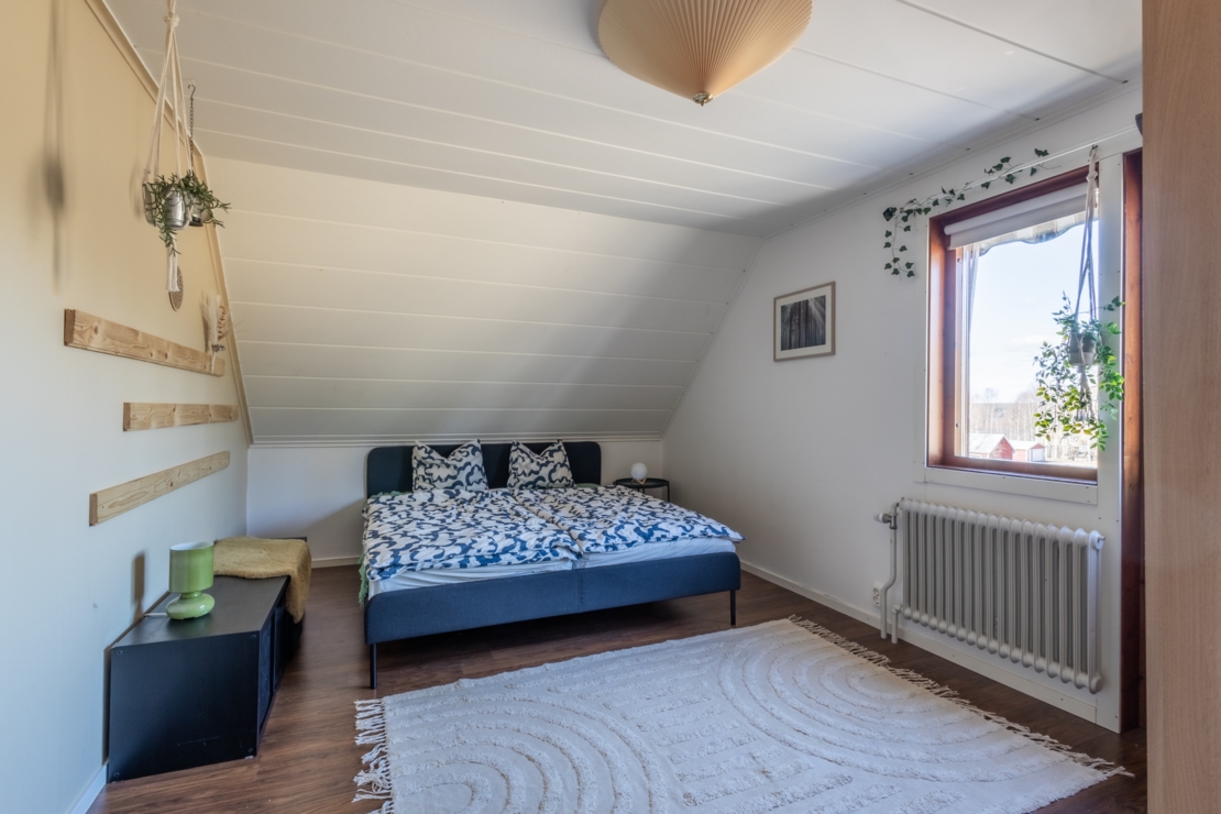 Övervåningen rymmer två sovrum med goda förvaringsmöjligheter och ett extra utrymme som kan användas som hobbyrum, förråd, eller byggas om till ett extra badrum om så önskas.