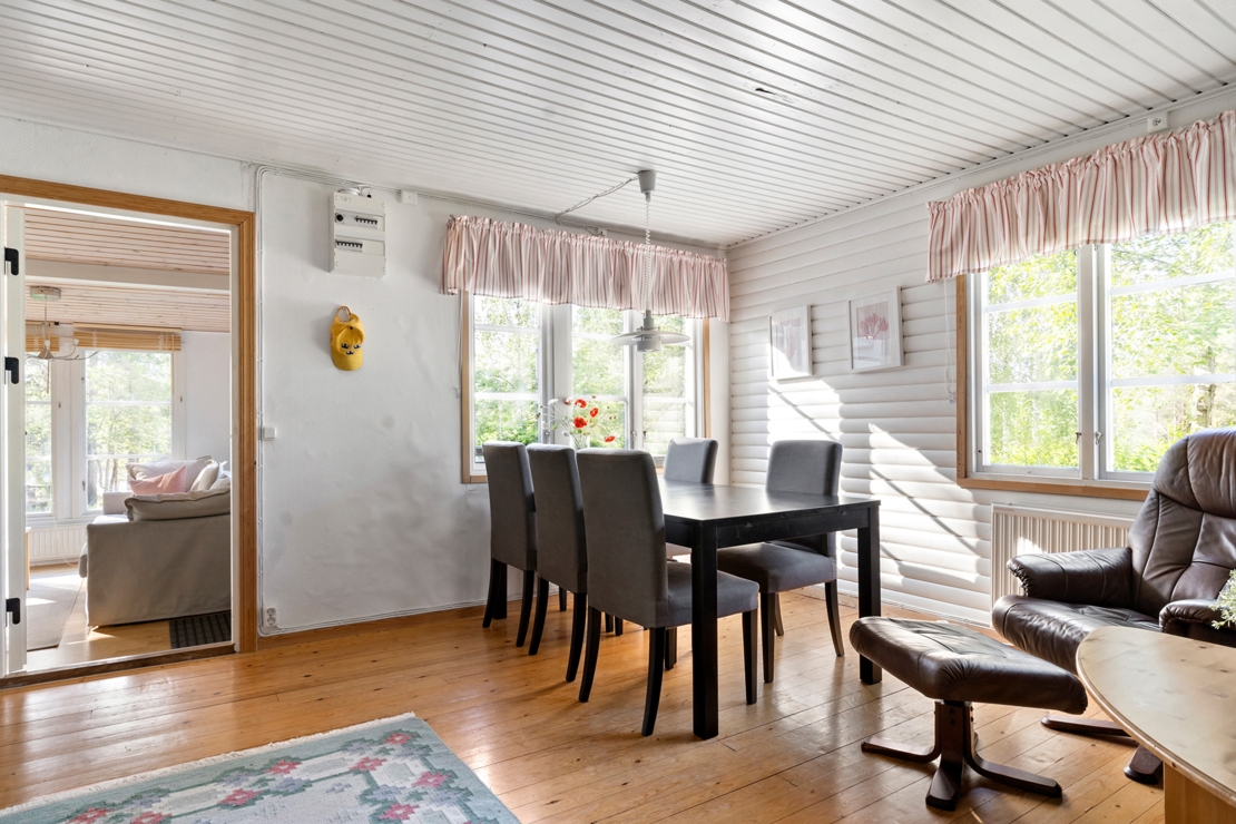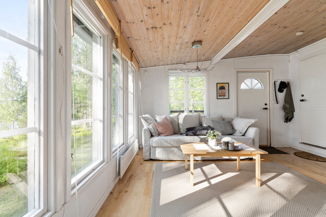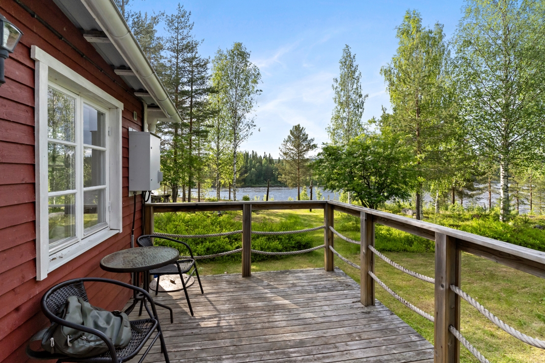 En härlig altan i västläge bjuder på en fascinerande utsikt över älven, och på husets andra sida finns ett inglasat uterum mot den omgivande skogen – perfekt för lugna stunder året runt.